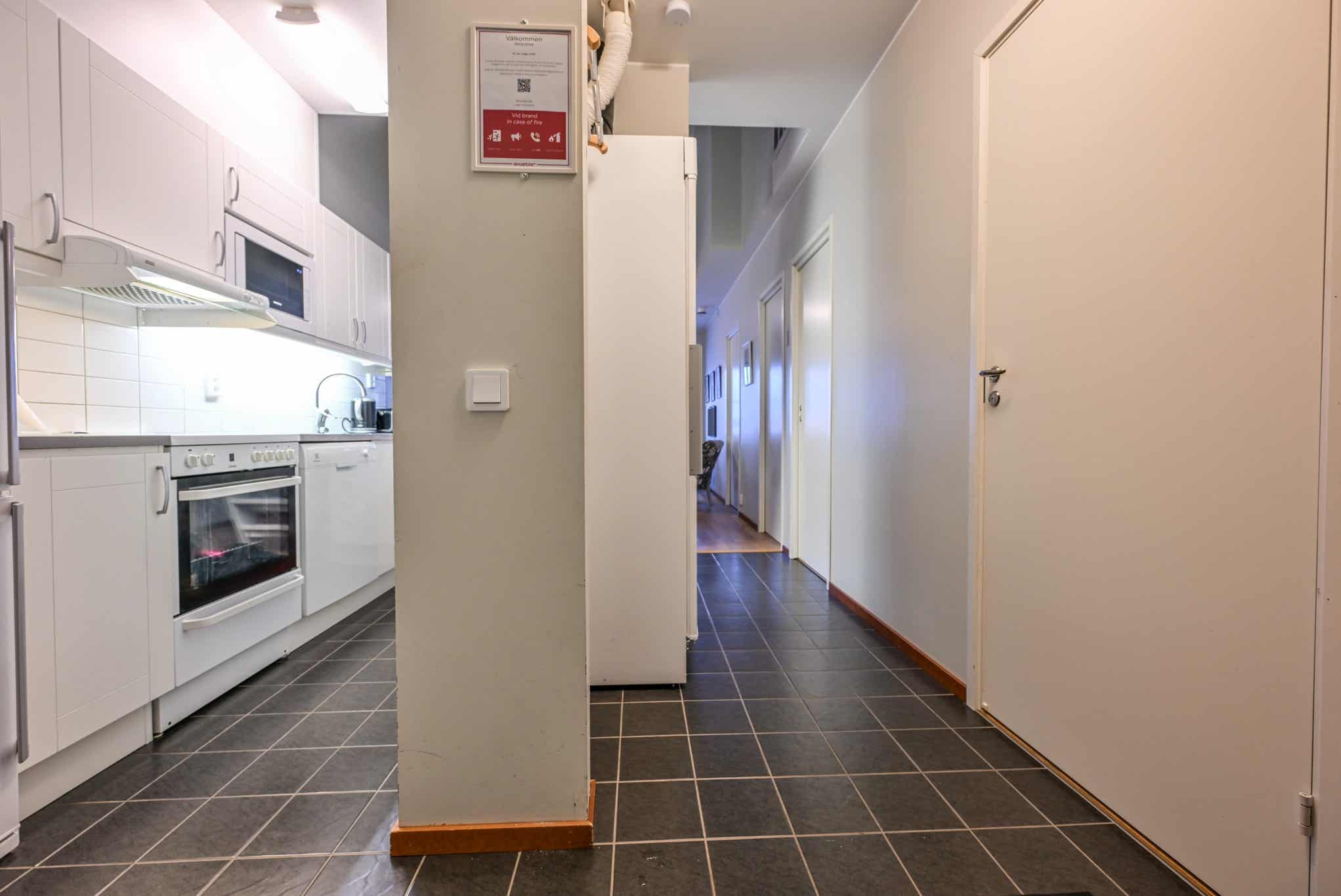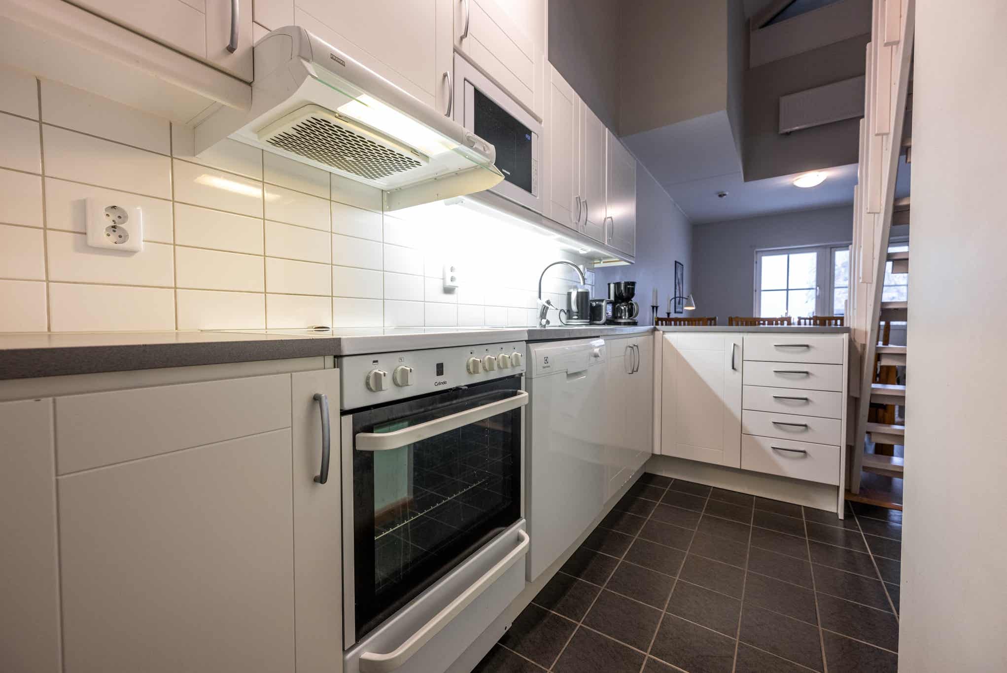 De keuken is voorzien van fornuis met oven, koelkast, vriezer, vaatwasser, magnetron.