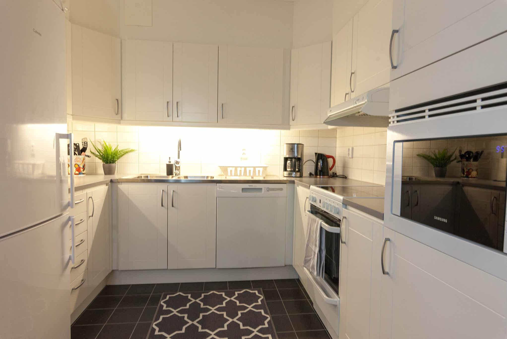 De keuken is voorzien van elektrische kookplaat met oven, koelkast, vriezer, vaatwasser, magnetron.