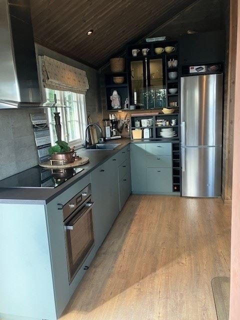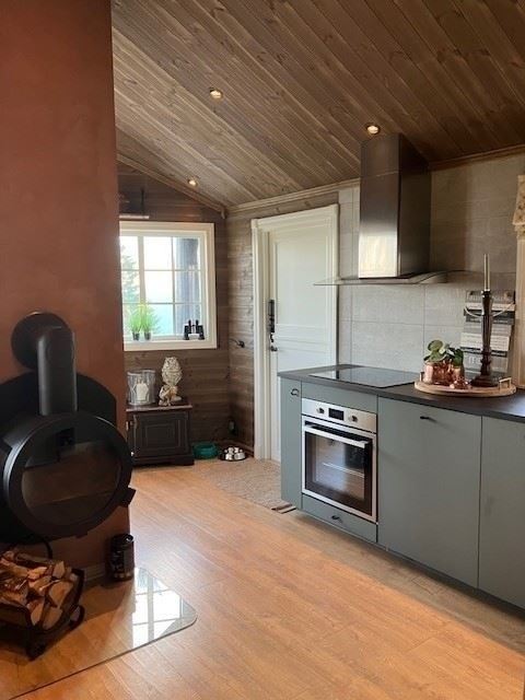 Hemsætervegen 160B biedt alles wat u nodig heeft voor een ontspannen verblijf. De keuken is voorzien van een koelkast, vriezer, gasfornuis, vaatwasser, magnetron en koffiezetapparaat.