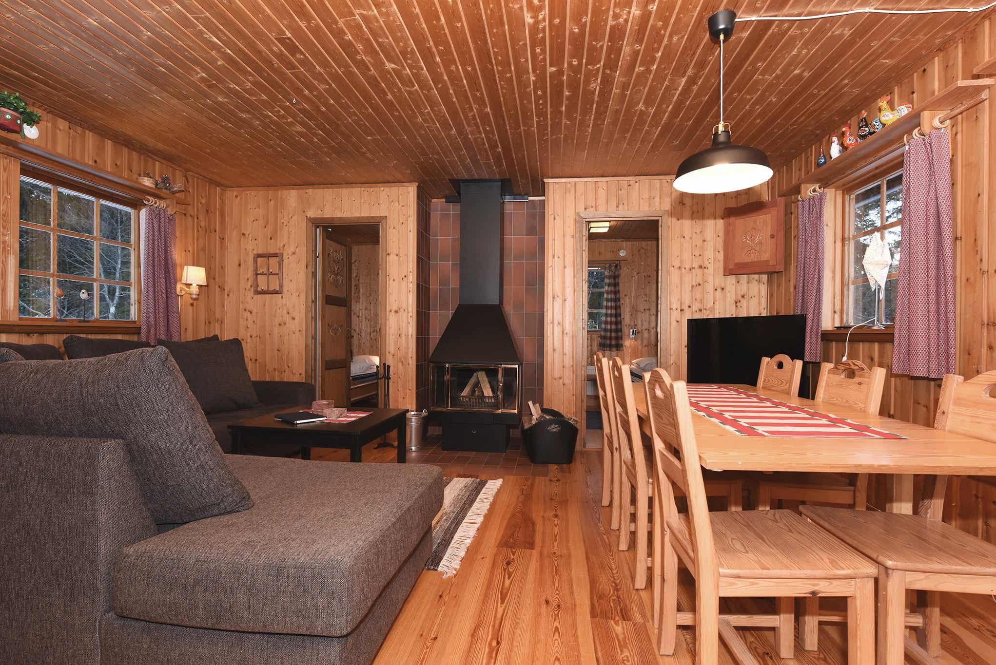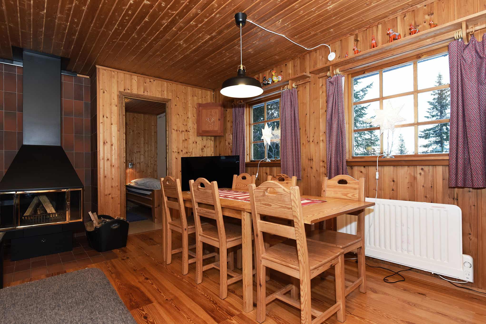 TV, open haard (hout is niet inbegrepen), motorvoorverwarmer aanwezig, steile trap naar de hut.