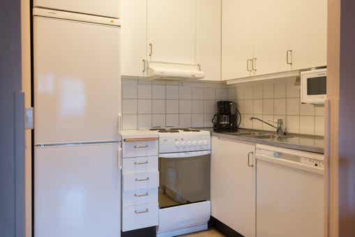 De keuken is voorzien van fornuis met oven, koelkast, vriezer, vaatwasser, magnetron.