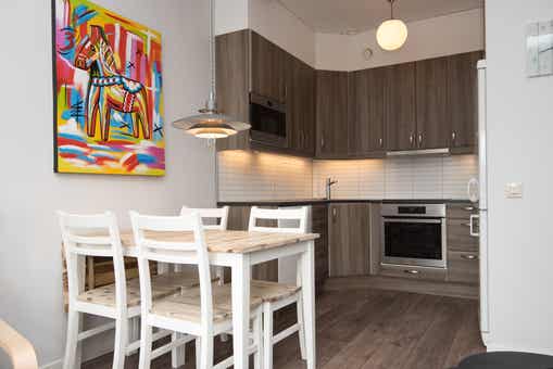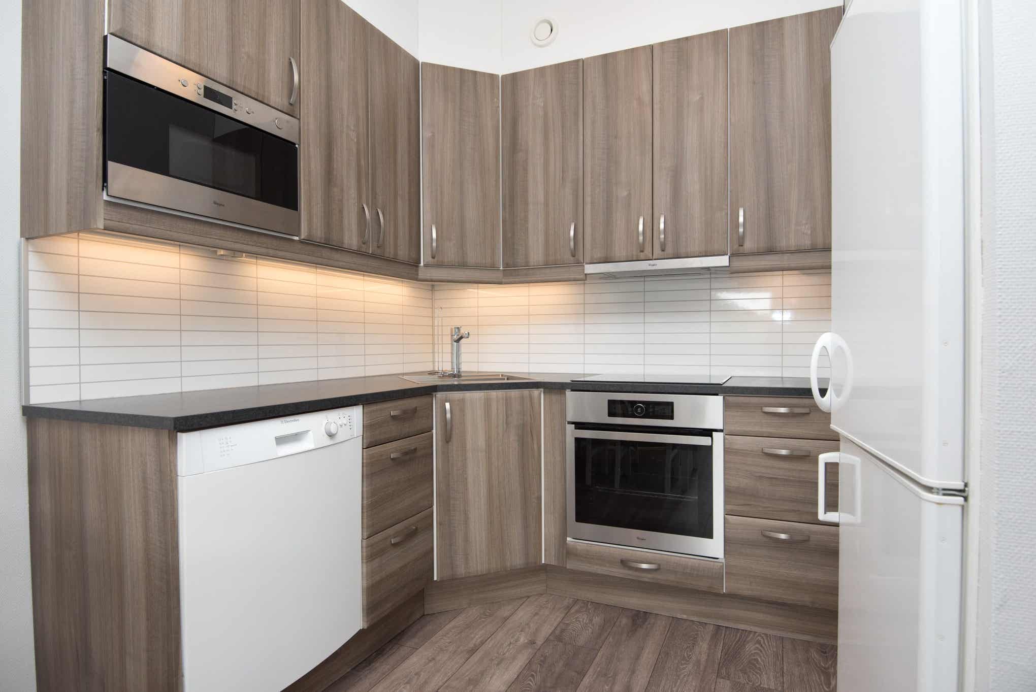 De keuken is voorzien van fornuis met oven, koelkast, vriezer, magnetron, vaatwasser.