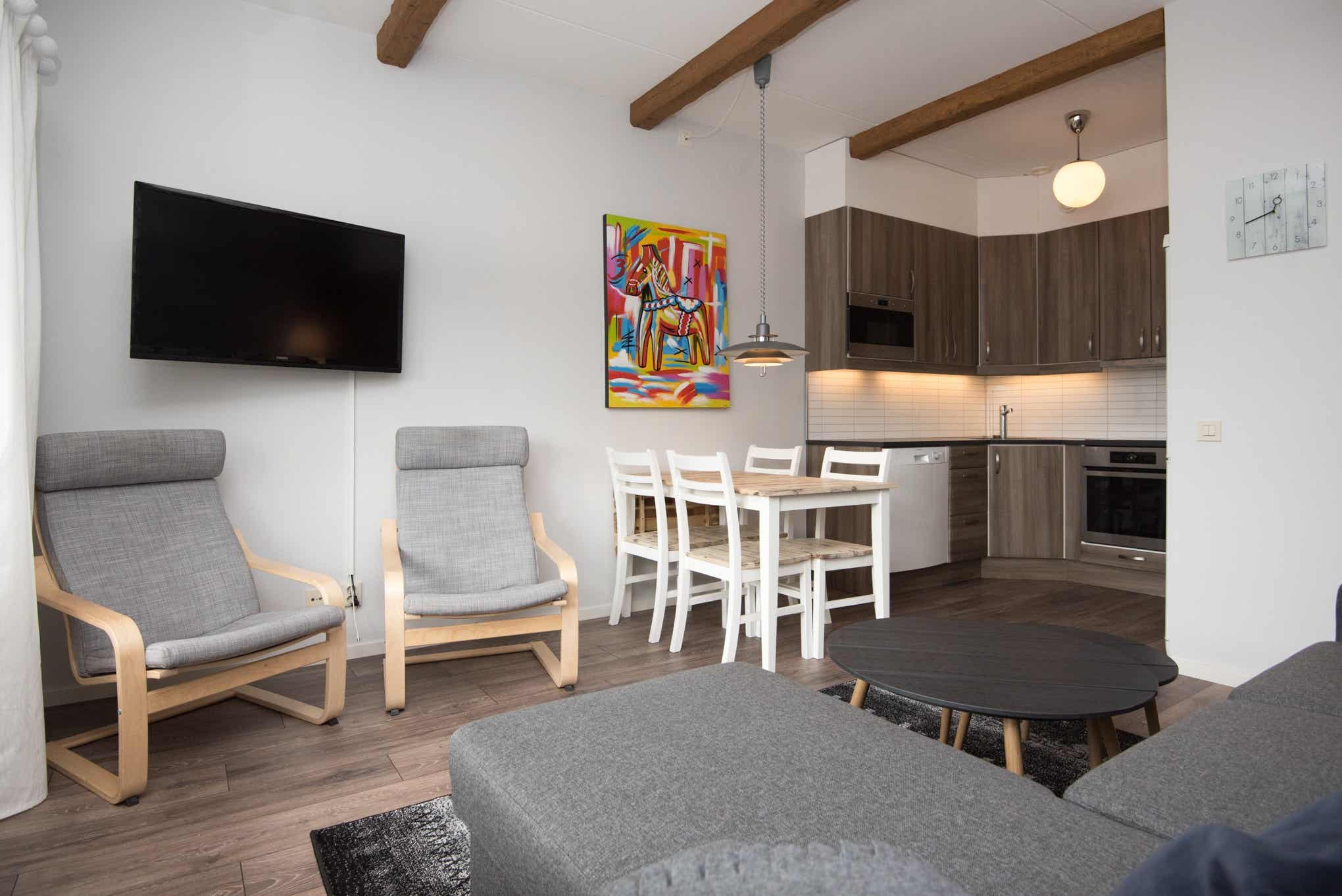 Woonkamer met gecombineerde keuken.