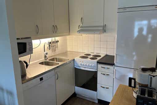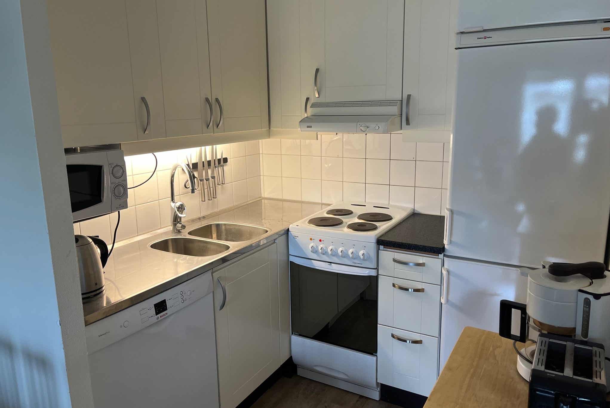 De keuken is voorzien van fornuis met oven, koelkast, vriezer, vaatwasser, magnetron.