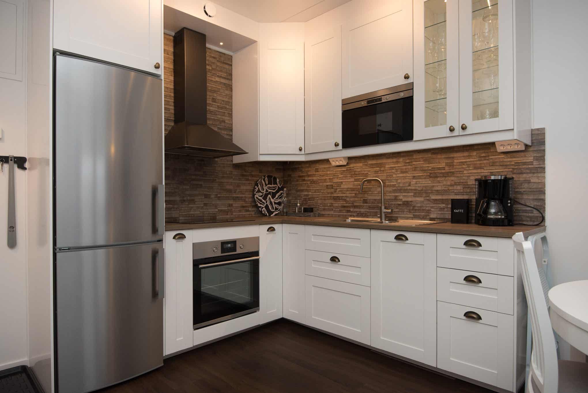 De keuken is voorzien van fornuis met oven, koelkast, vriezer, magnetron, vaatwasser.
