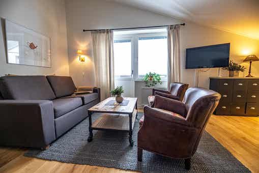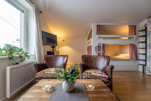 Woonkamer met gecombineerde keuken/woonkamer/slaapkamer, slaapbank voor 1 persoon, 1 stapelbed met 120 cm breed onderbed.