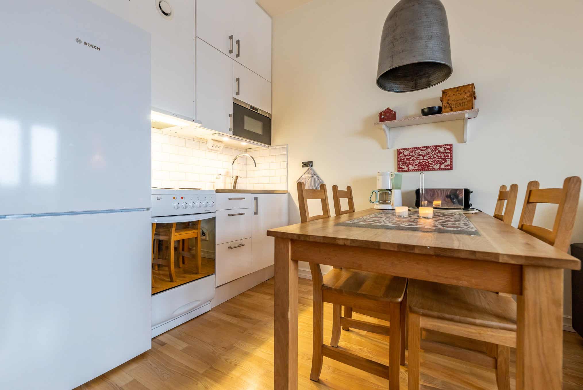 De keuken is voorzien van fornuis met oven, koelkast, vriezer, magnetron.