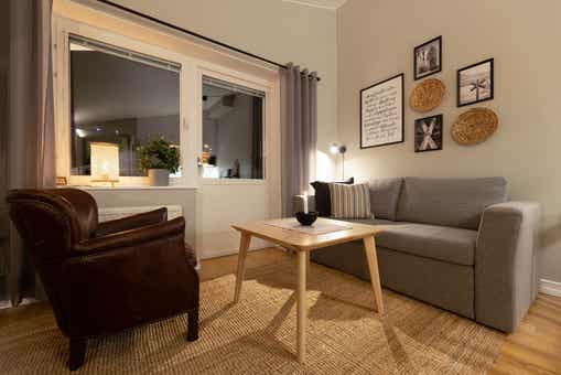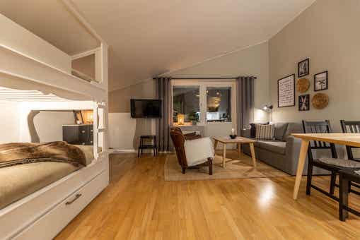 Woonkamer met gecombineerde keuken/woonkamer/slaapkamer, slaapbank voor 1 persoon, 1 stapelbed met 120 cm breed onderbed.