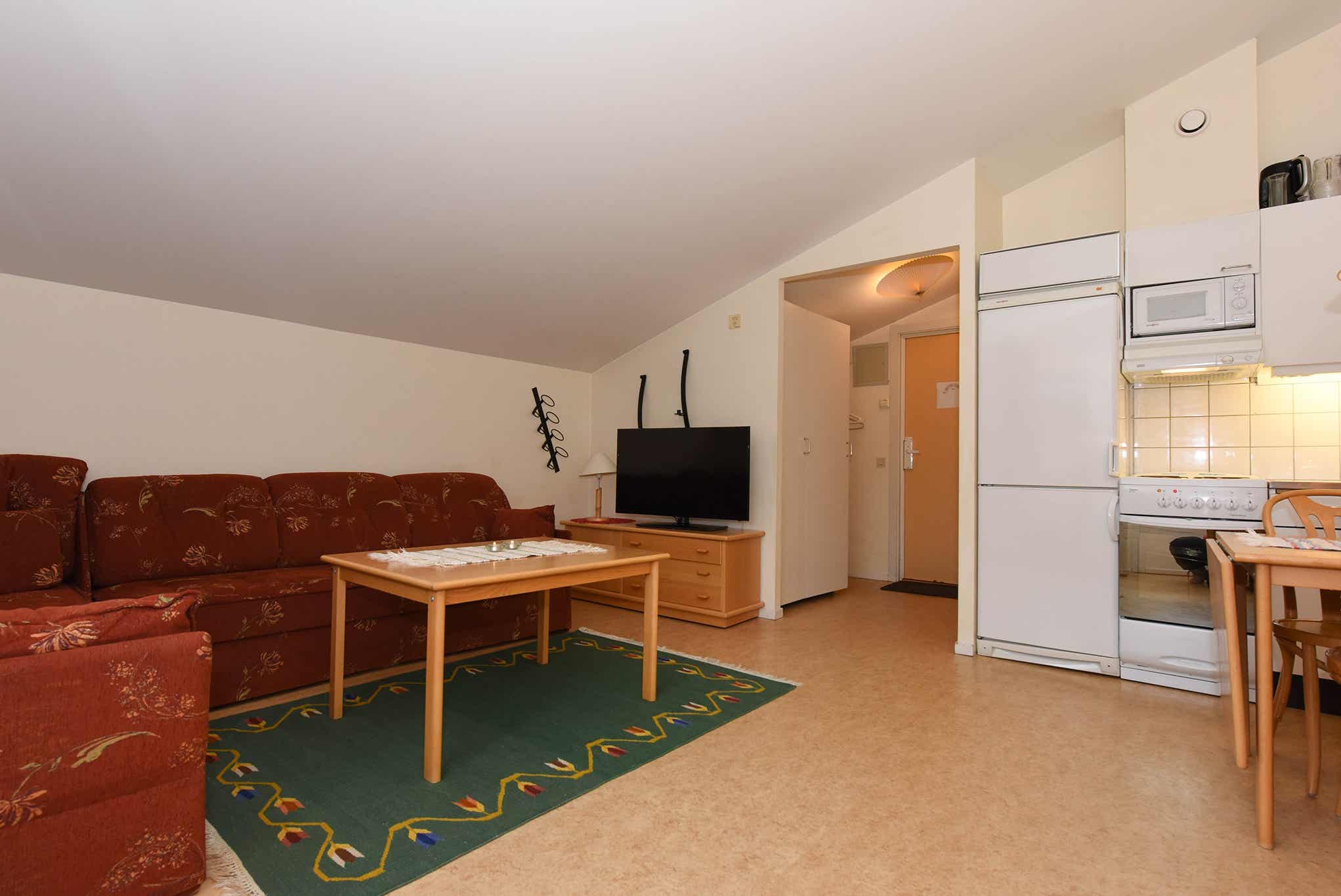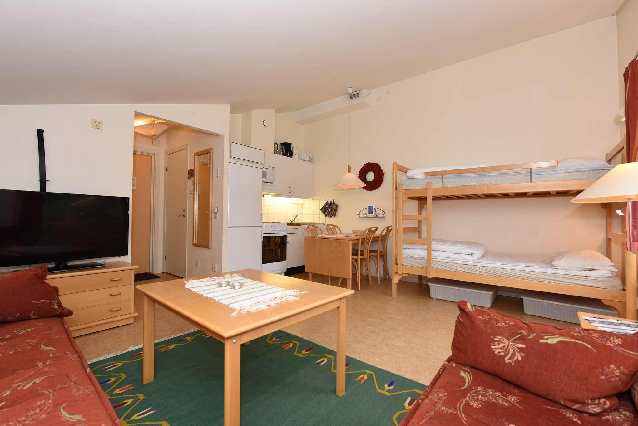 Woonkamer met gecombineerde keuken/woonkamer/slaapkamer, slaapbank voor twee personen, 1 stapelbed.