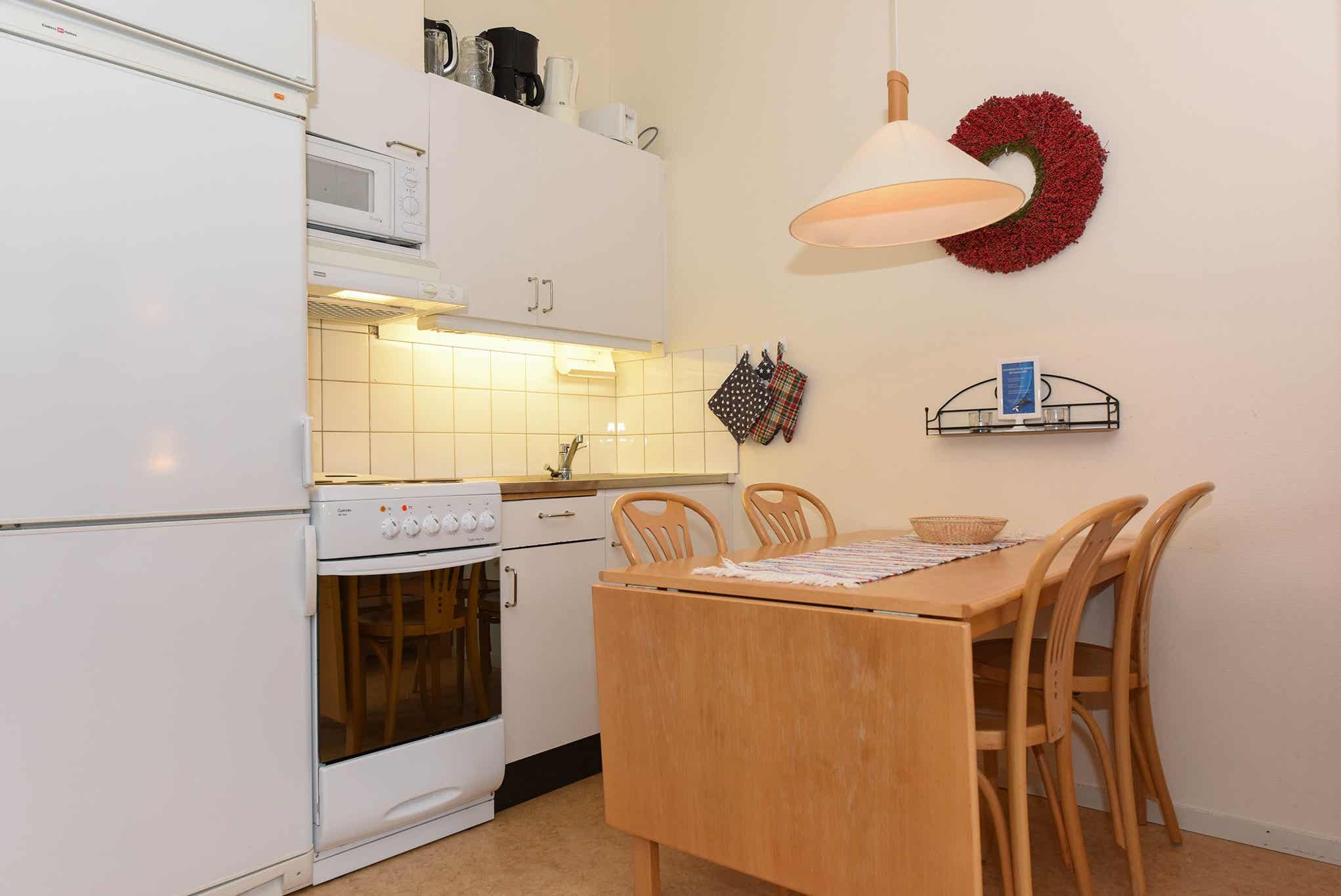 De keuken is voorzien van fornuis met oven, koelkast, vriezer, magnetron.