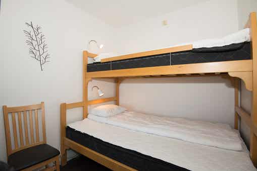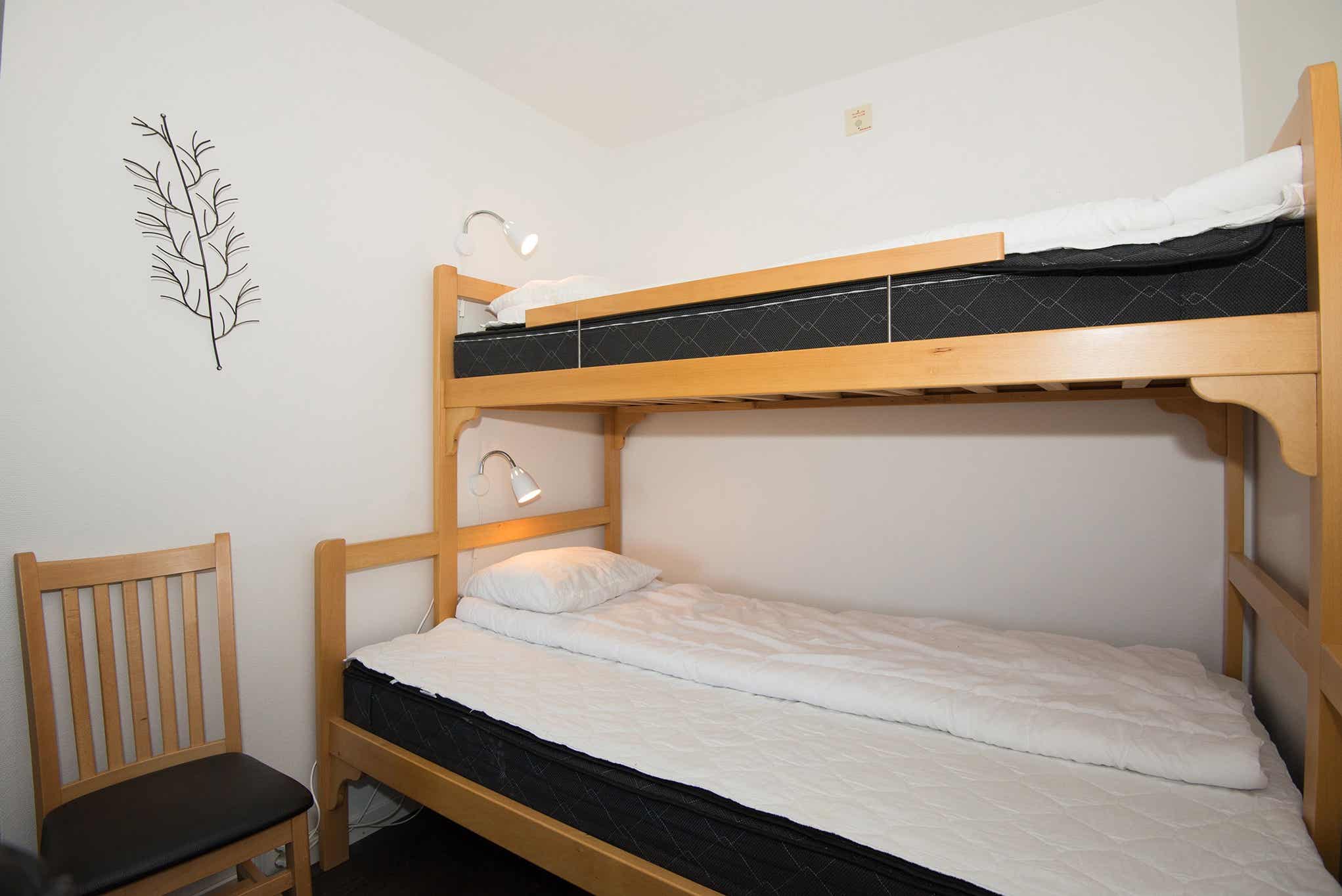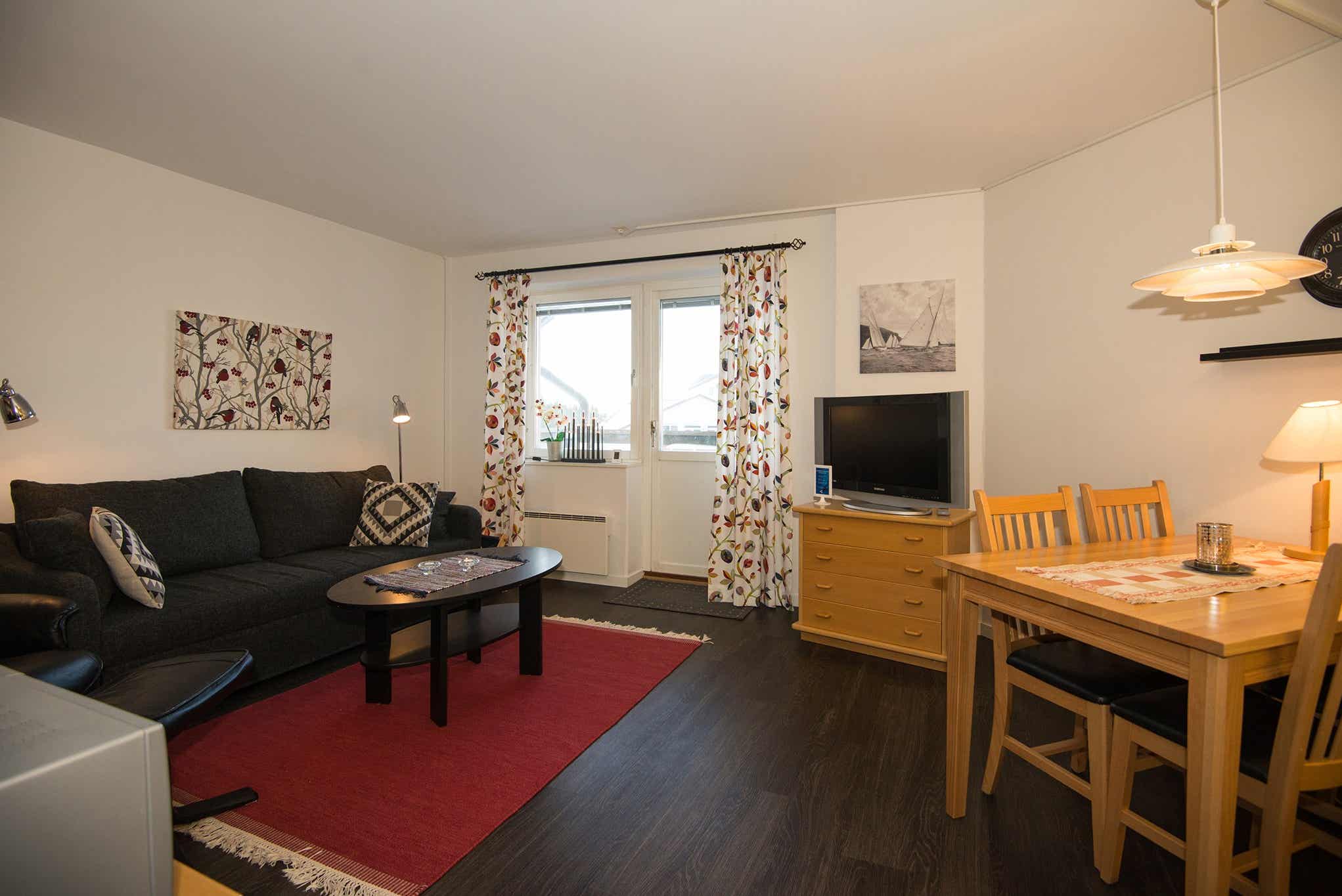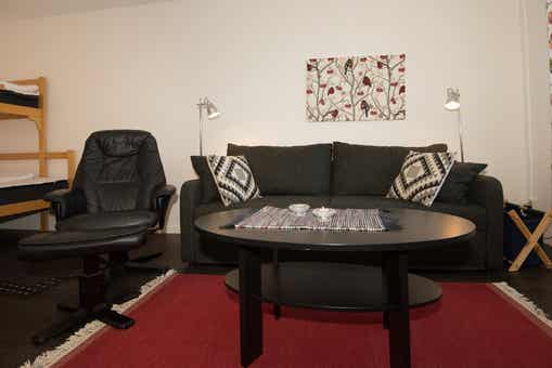 Woonkamer met gecombineerde keuken/woonkamer/slaapkamer, slaapbank voor twee personen, 1 stapelbed met 120 cm breed onderbed.