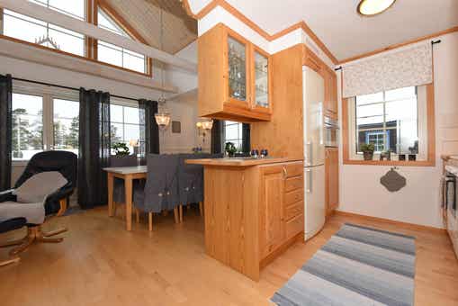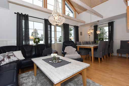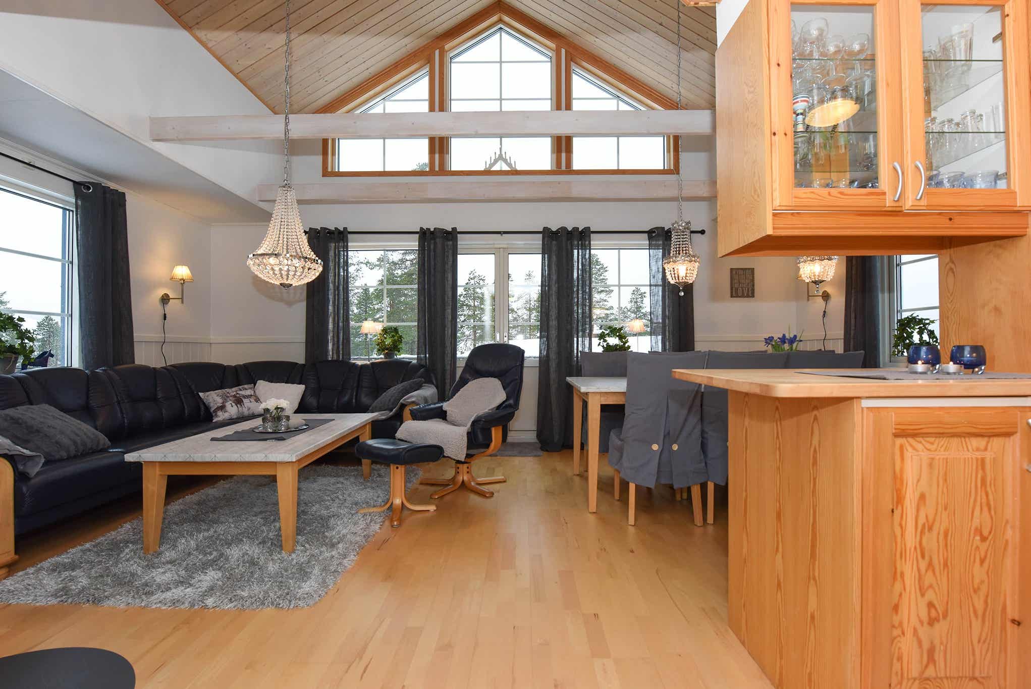 Horizon Lodge ligt in Hundfjället. Vrijstaand huisje met vide, 8+2 bedden, 100 m², woonkamer met gecombineerde keuken, 3 slaapkamers, 1 bed vide, 2 douches, 2 WC, sauna.