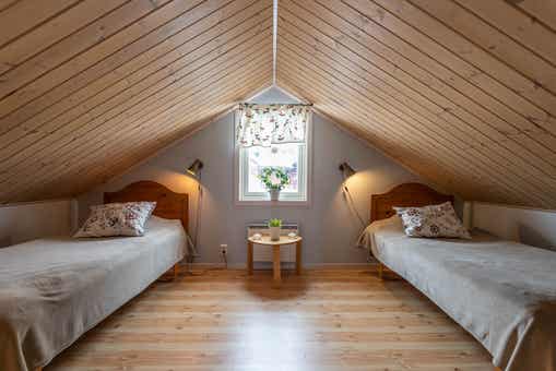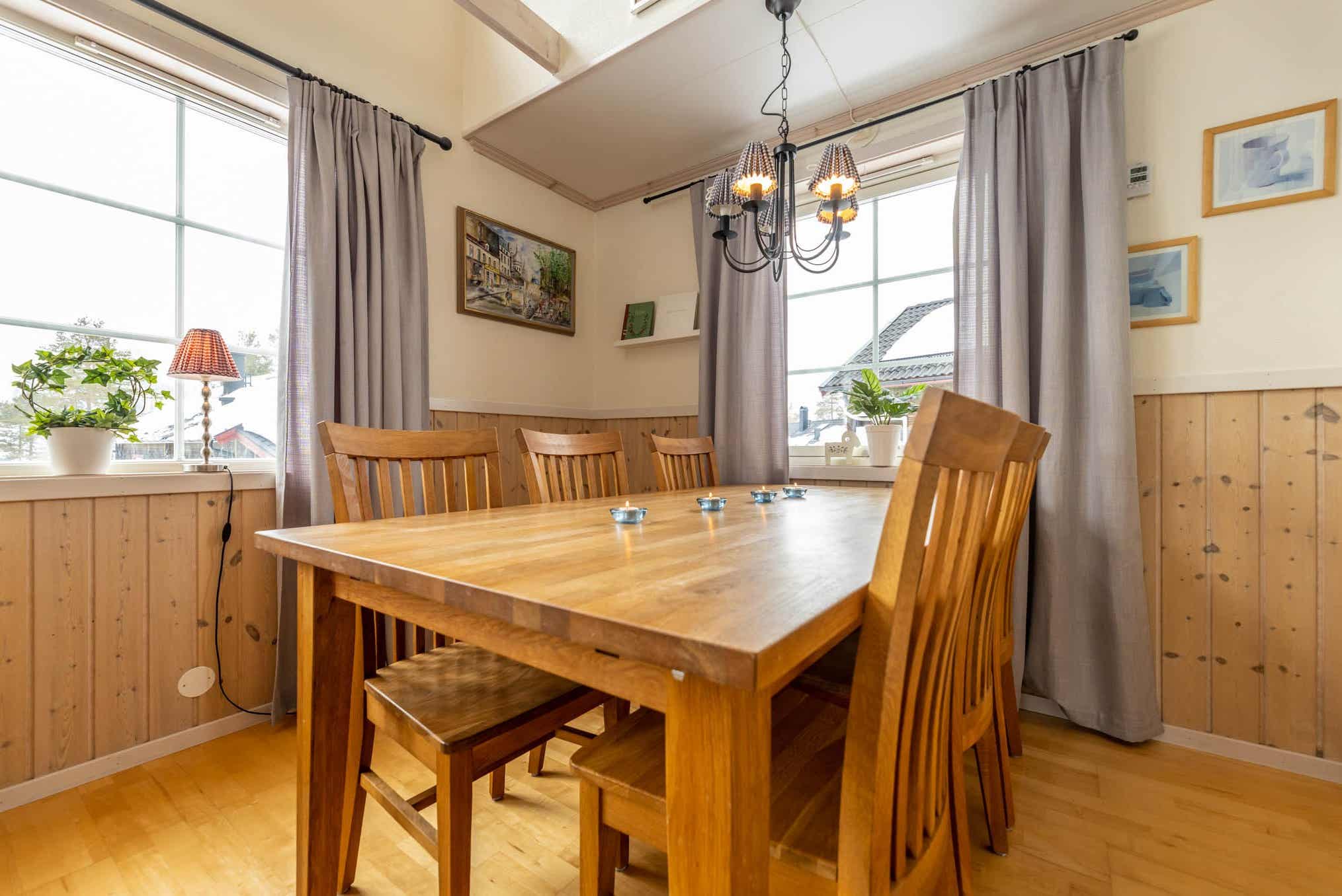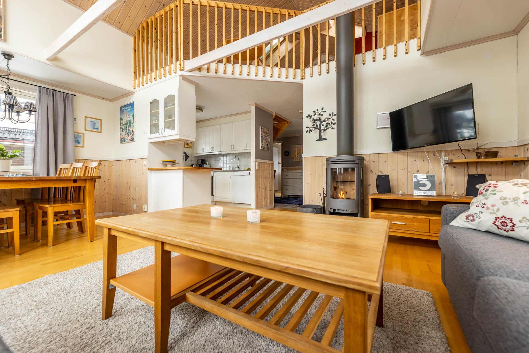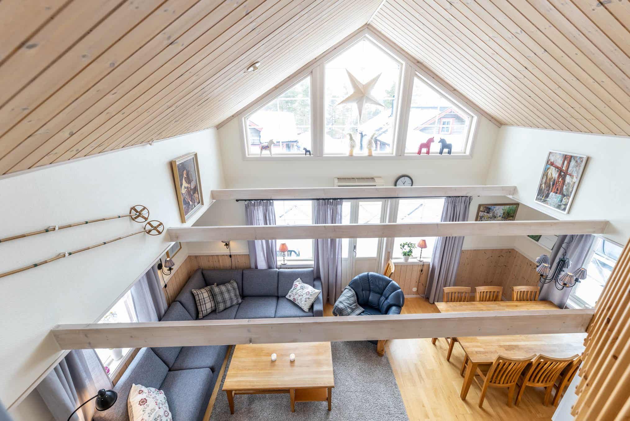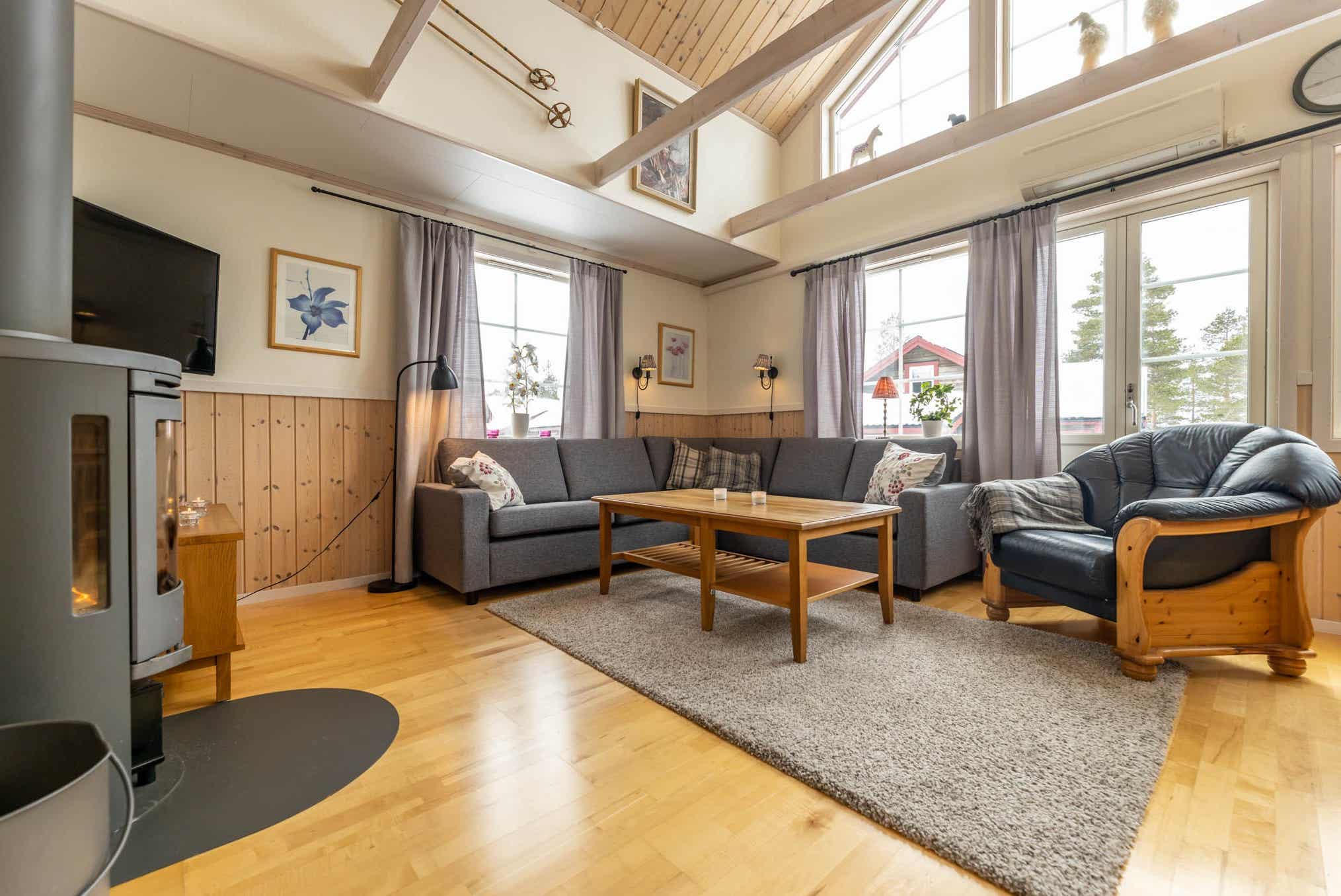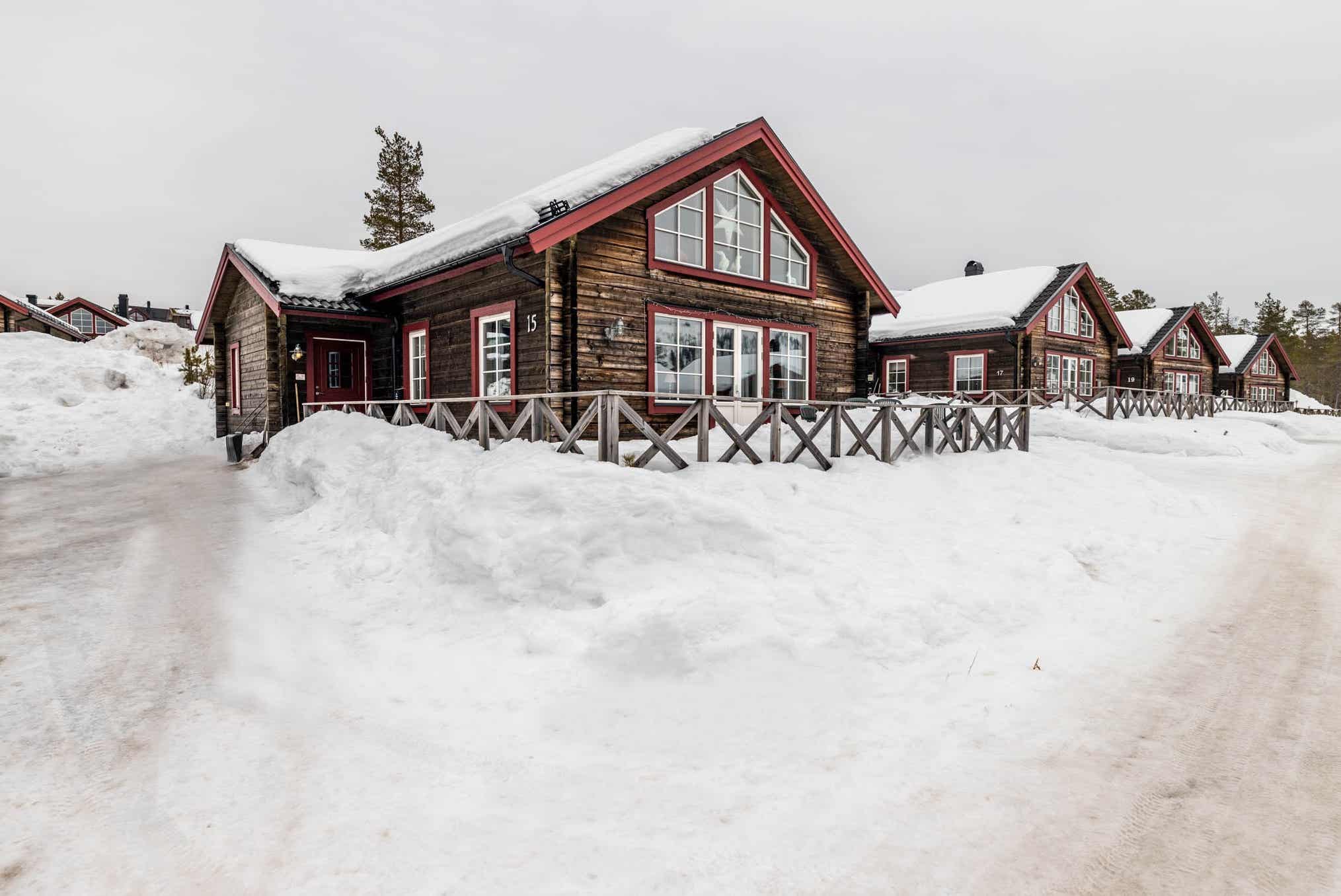Horizon Lodge ligt in Hundfjället. Vrijstaand huisje met vide, 6+2 bedden, 100 m², woonkamer met gecombineerde keuken, 3 slaapkamers, 2 douches, 2 WC, sauna.
