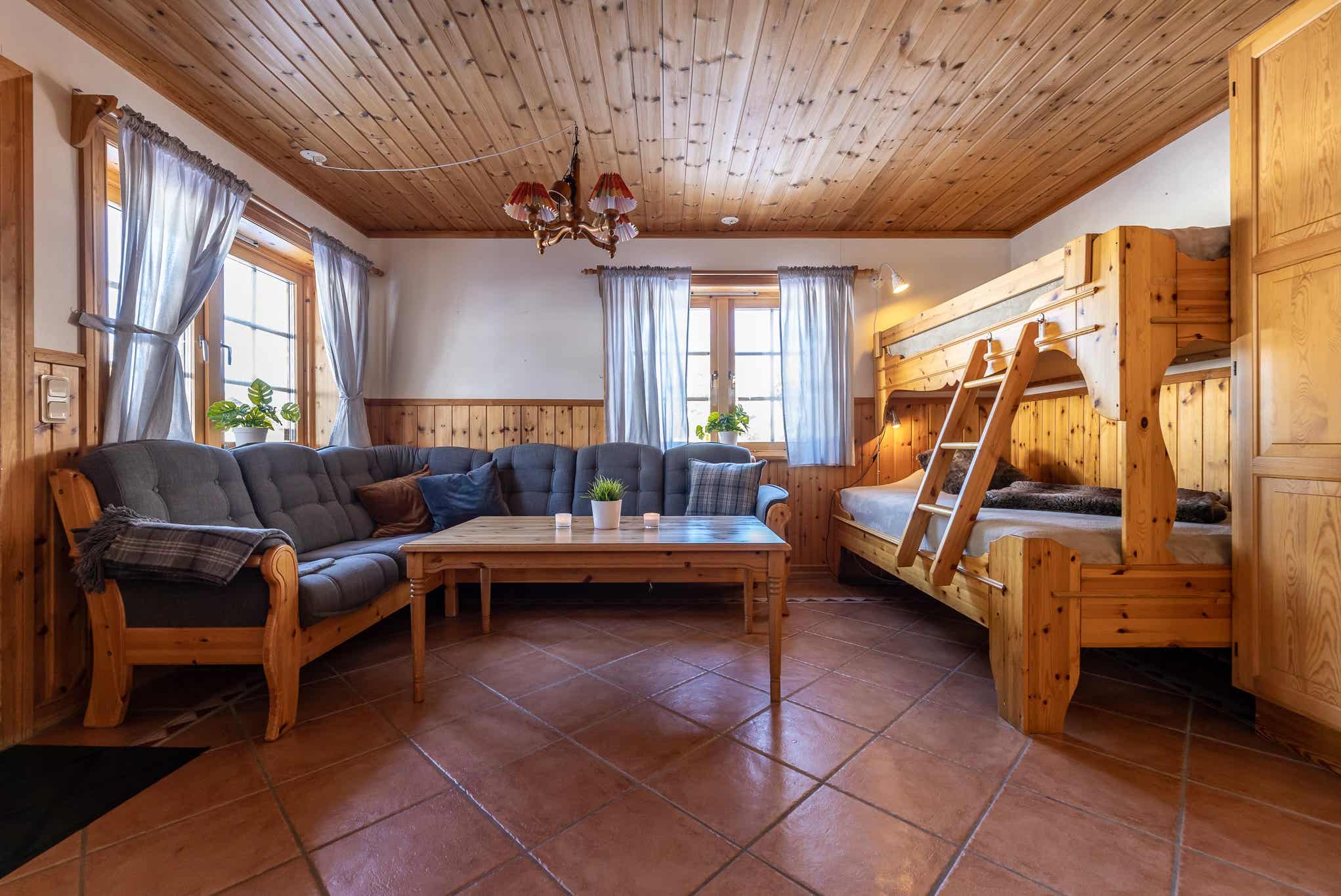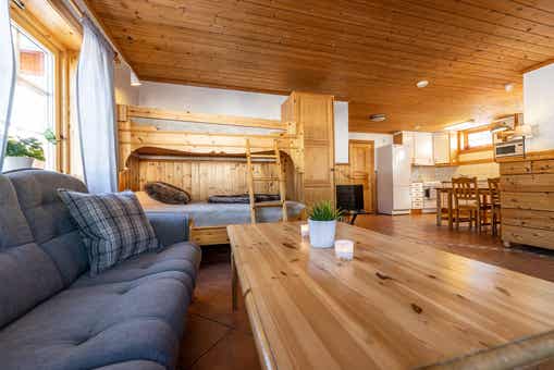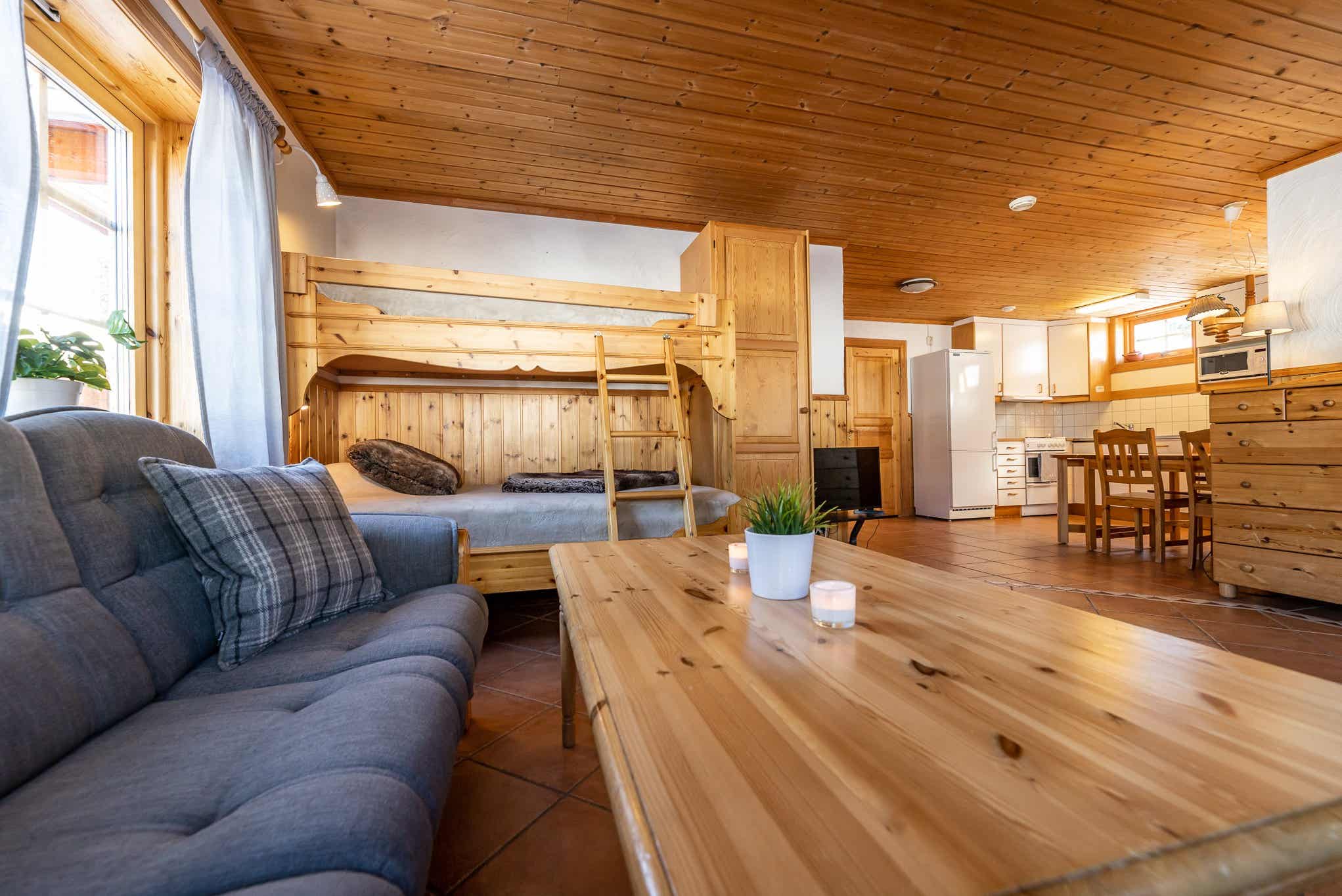 Woonkamer met gecombineerde keuken, 1 stapelbed met 120 cm breed onderbed.