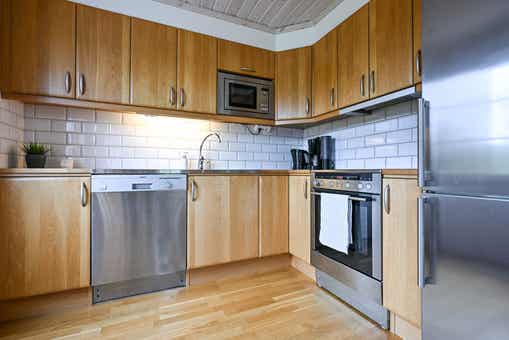 De keuken is voorzien van kookplaat, oven, koelkast, vriezer, vaatwasser, magnetron.
