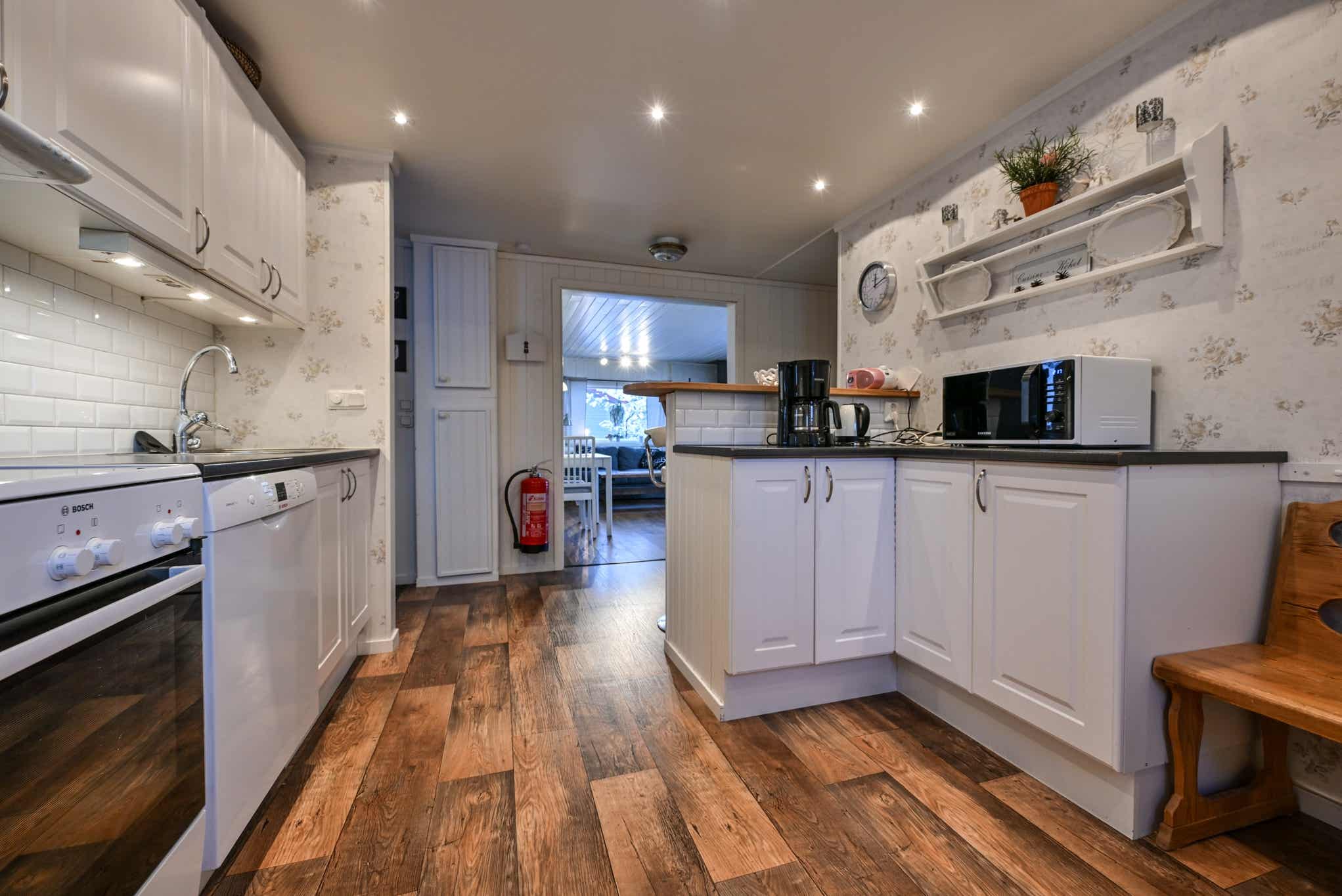 De keuken is voorzien van fornuis met oven, koelkast, vriezer, vaatwasser, magnetron.