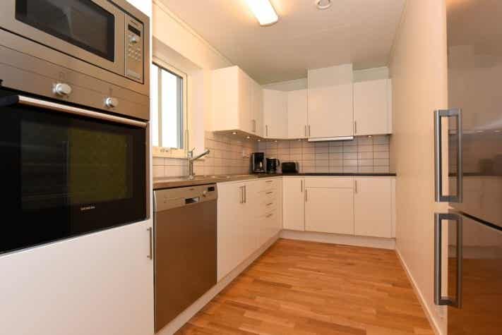 De keuken is voorzien van elektrische kookplaat met oven, koelkast, vriezer, vaatwasser, magnetron.