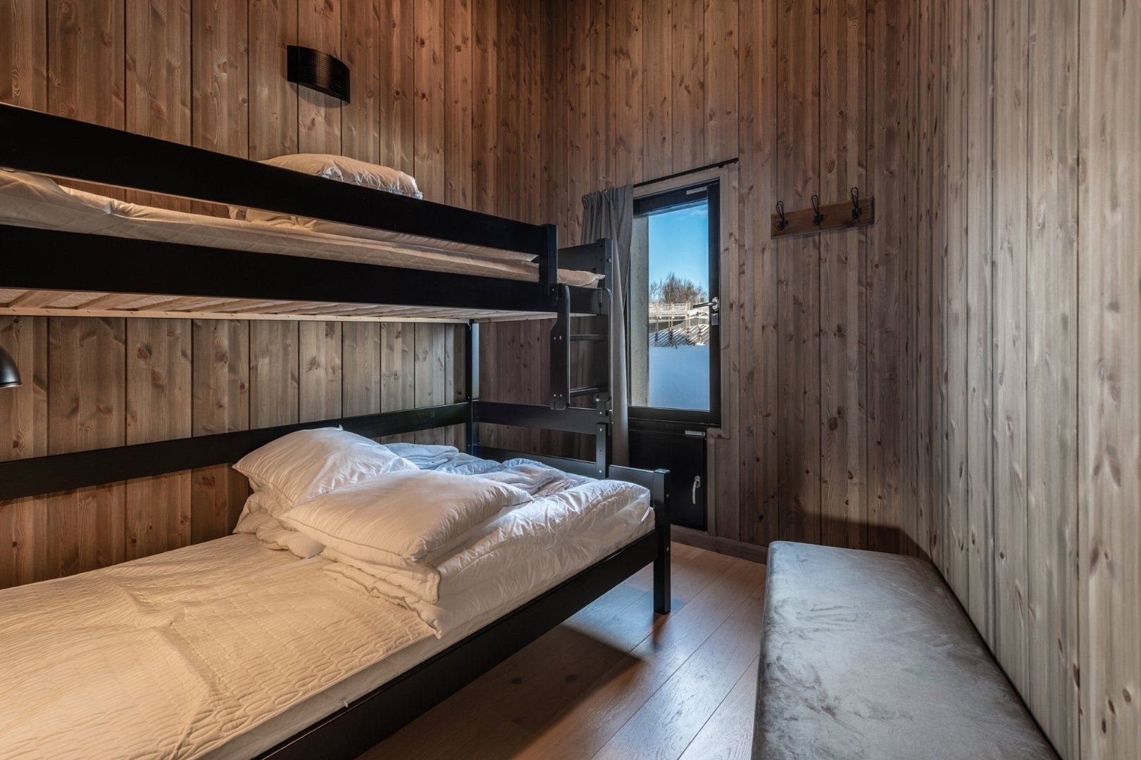 Slaapkamer 2 heeft een stapelbed van 120 + 90 cm.