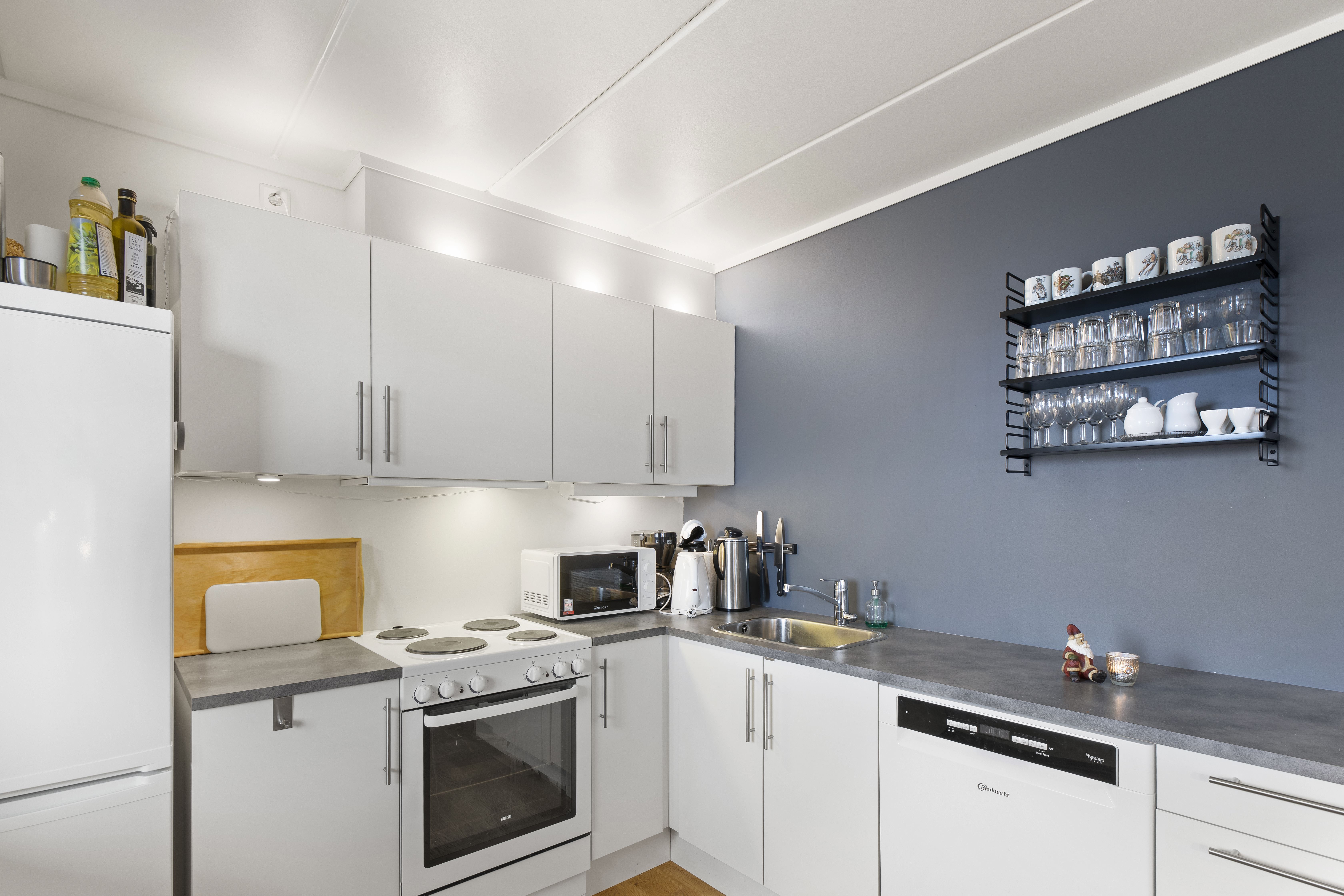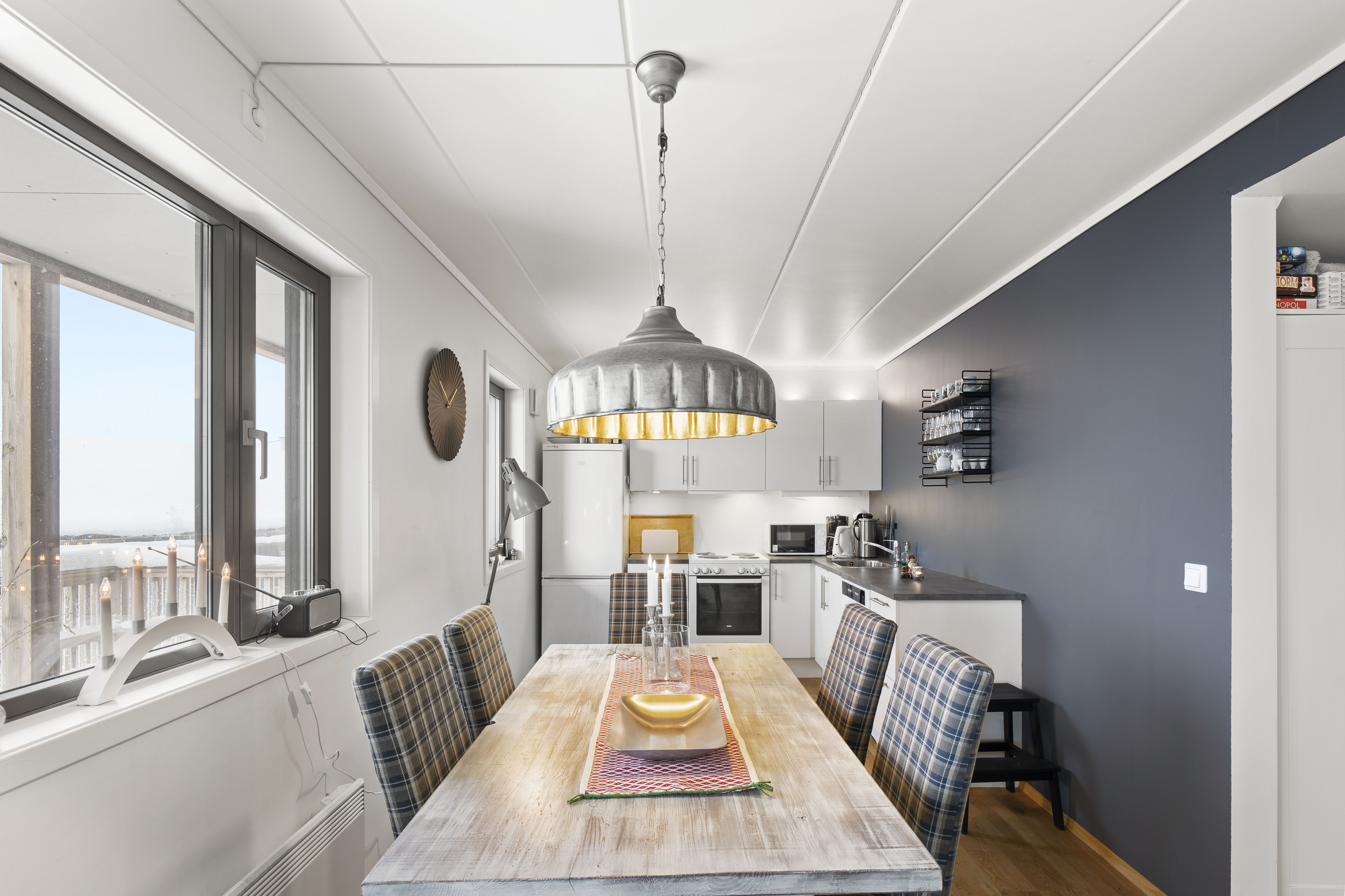Kjusgrenda 87a biedt alles wat u nodig heeft voor een ontspannen verblijf. In de keuken vindt u een fornuis, koelkast, vriezer, magnetron, vaatwasser en koffiezetapparaat.
