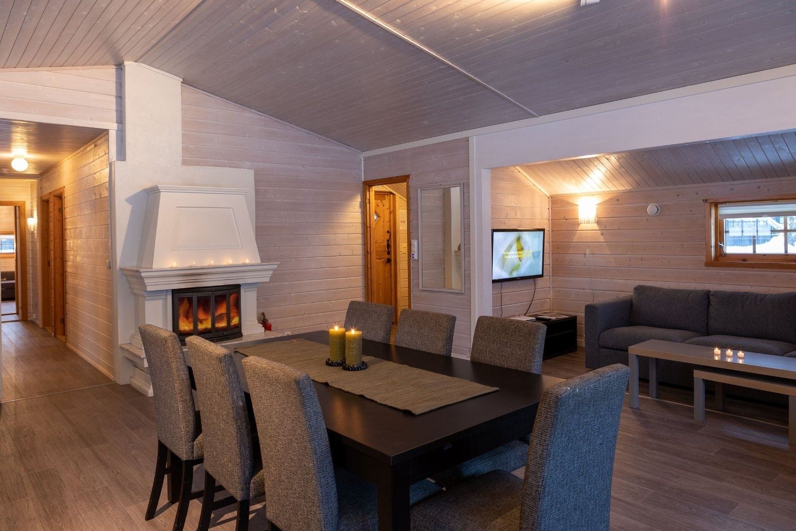 Na een dag vol activiteiten kunt u heerlijk ontspannen in de woonkamer, die is ingericht met een bank, televisie en een warme open haard, ideaal voor gezellige avonden bij het haardvuur.