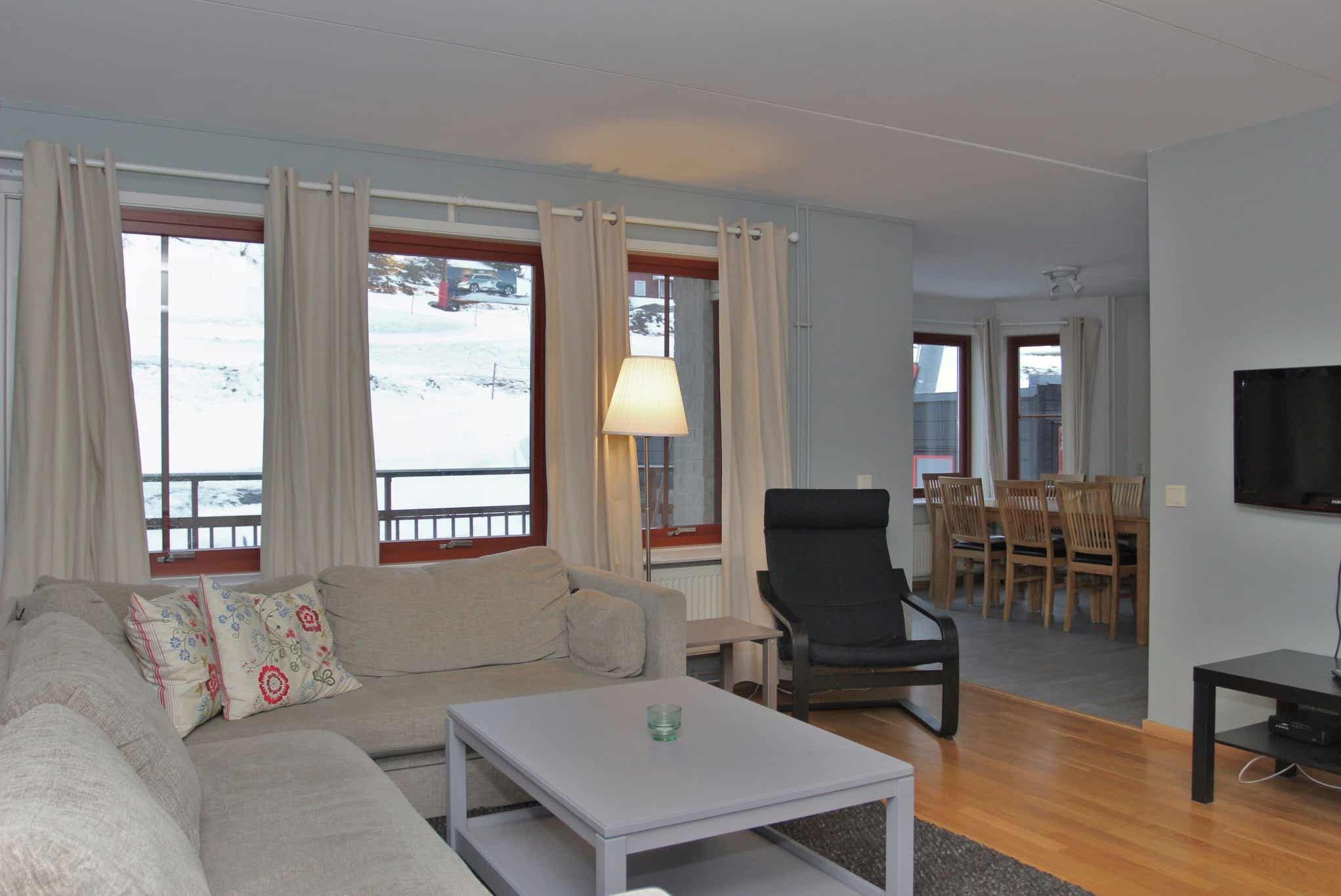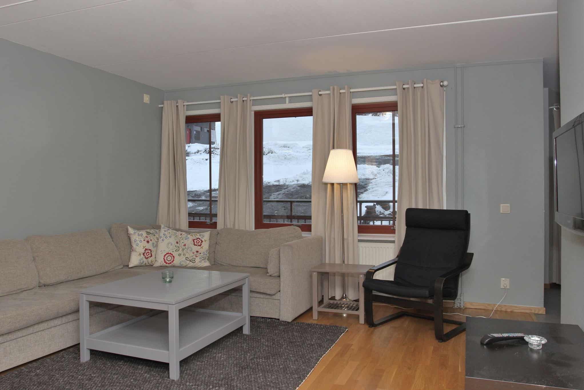 Liengården ligt in Åre By. Appartement op verdieping 3, 6 bedden, 77 m², woonkamer met gecombineerde keuken, 3 slaapkamers, 1 douche, 1 toilet, sauna.