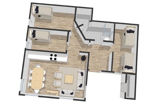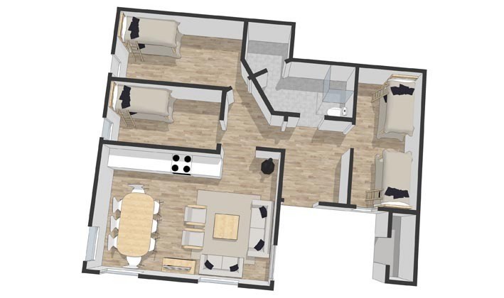 Appartement op de begane grond, 8 bedden, 68 m², woonkamer met gecombineerde keuken, 3 slaapkamers, 1 douche, 1 toilet, 1 sauna.
