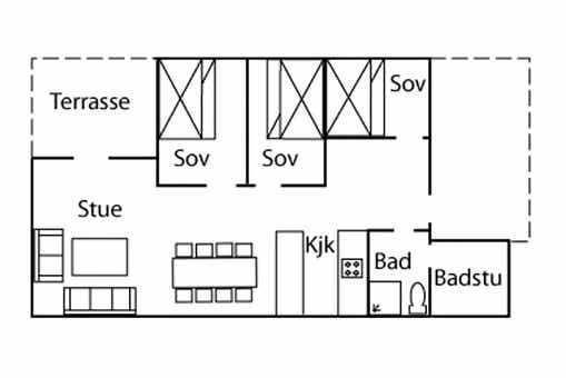 Slaapkamers:Slaapkamer 1= 1 stapelbed met 150 cm breed onderbed. Slaapkamer 2= 1 stapelbed met 120 cm breed onderbed. Slaapkamer 3= 1 stapelbed met 120 cm breed onderbed.