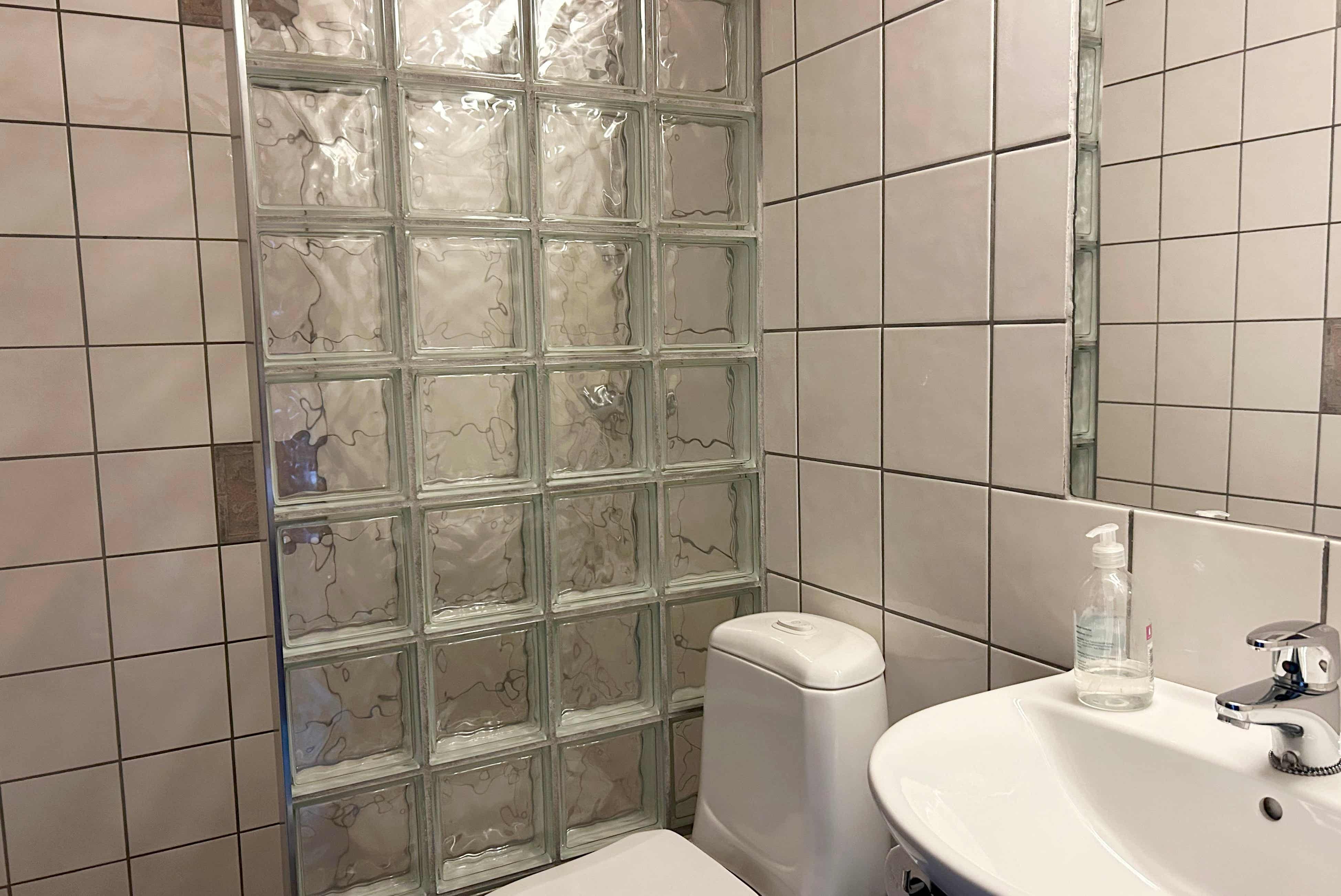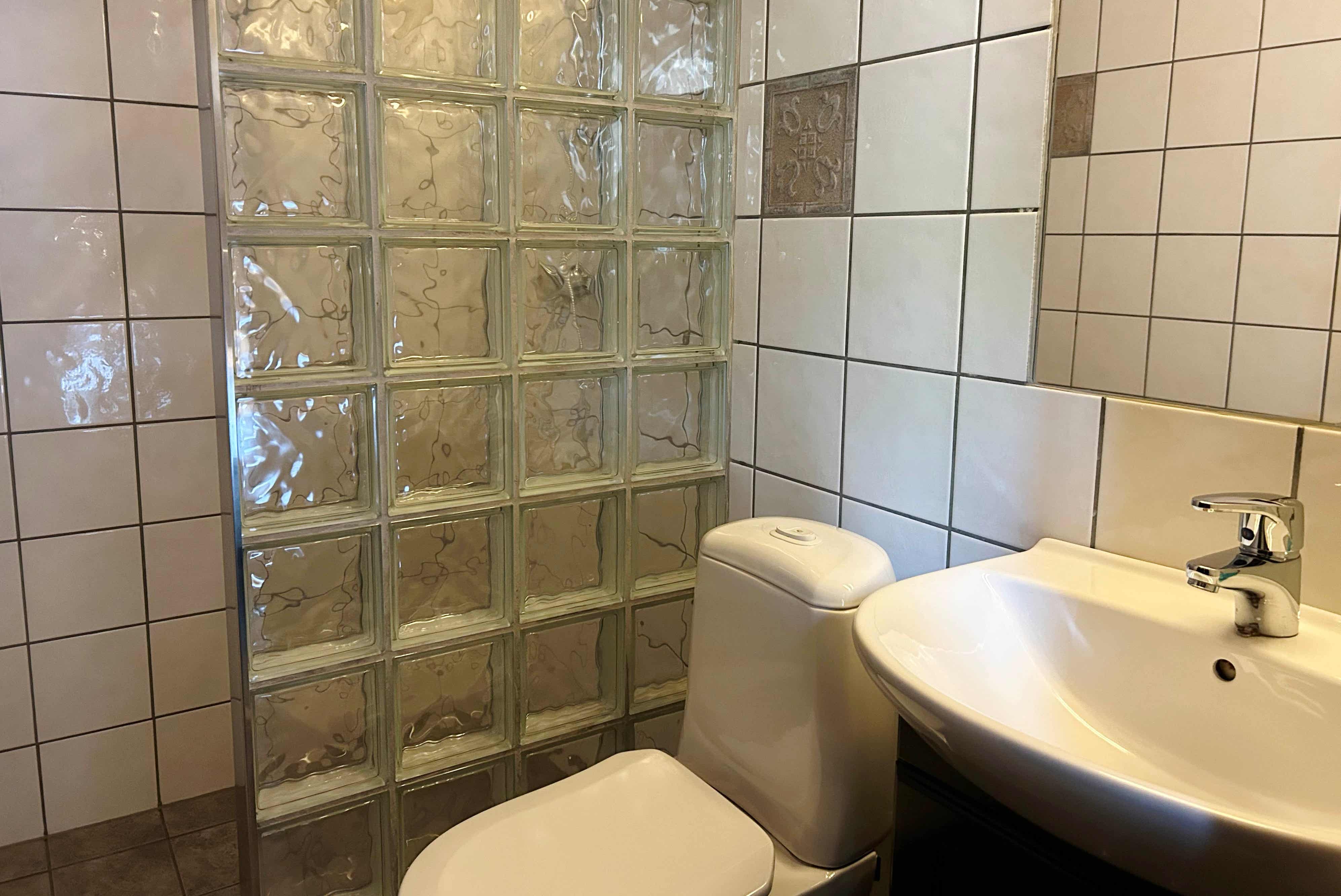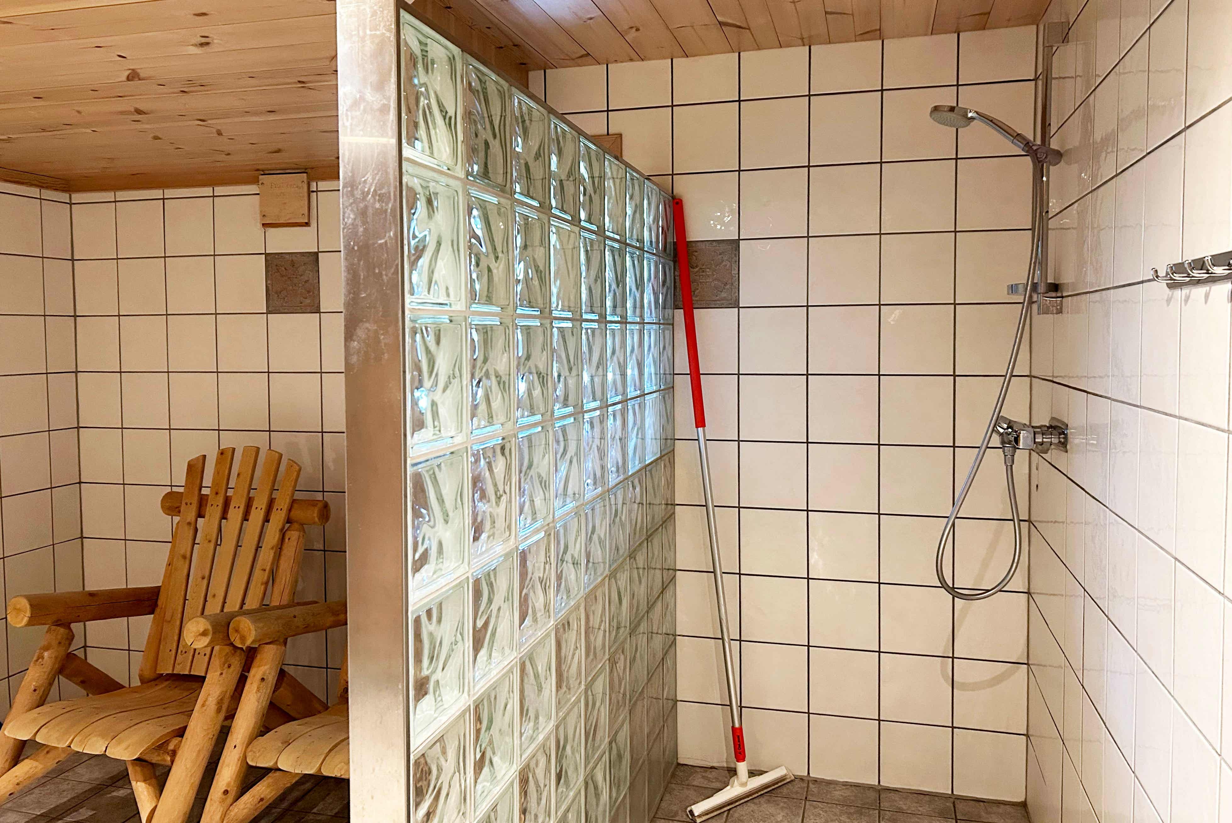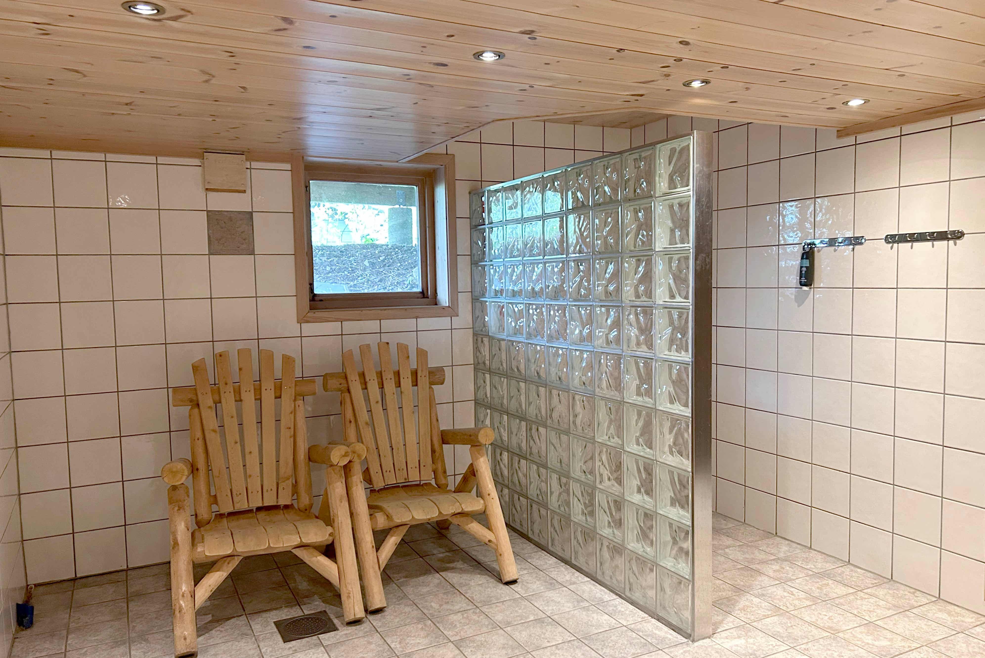 Badkamers:Badkamer 1: sauna, douche, toilet. Badkamer 2: douche, toilet. Badkamer 3: douche, toilet. Badkamer 4: douche, toilet. Badkamer 5: douche, toilet. Badkamer 6: douche, toilet. Badkamer 7: toilet.