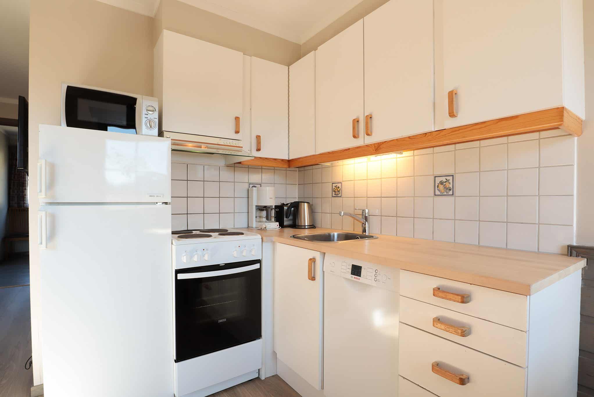 Keuken: fornuis, koelkast met vriesvak, vaatwasser, magnetron.