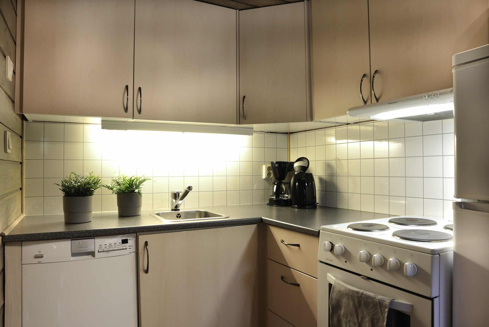 Keuken: fornuis, koelkast met vriesvak, vaatwasser, magnetron.
