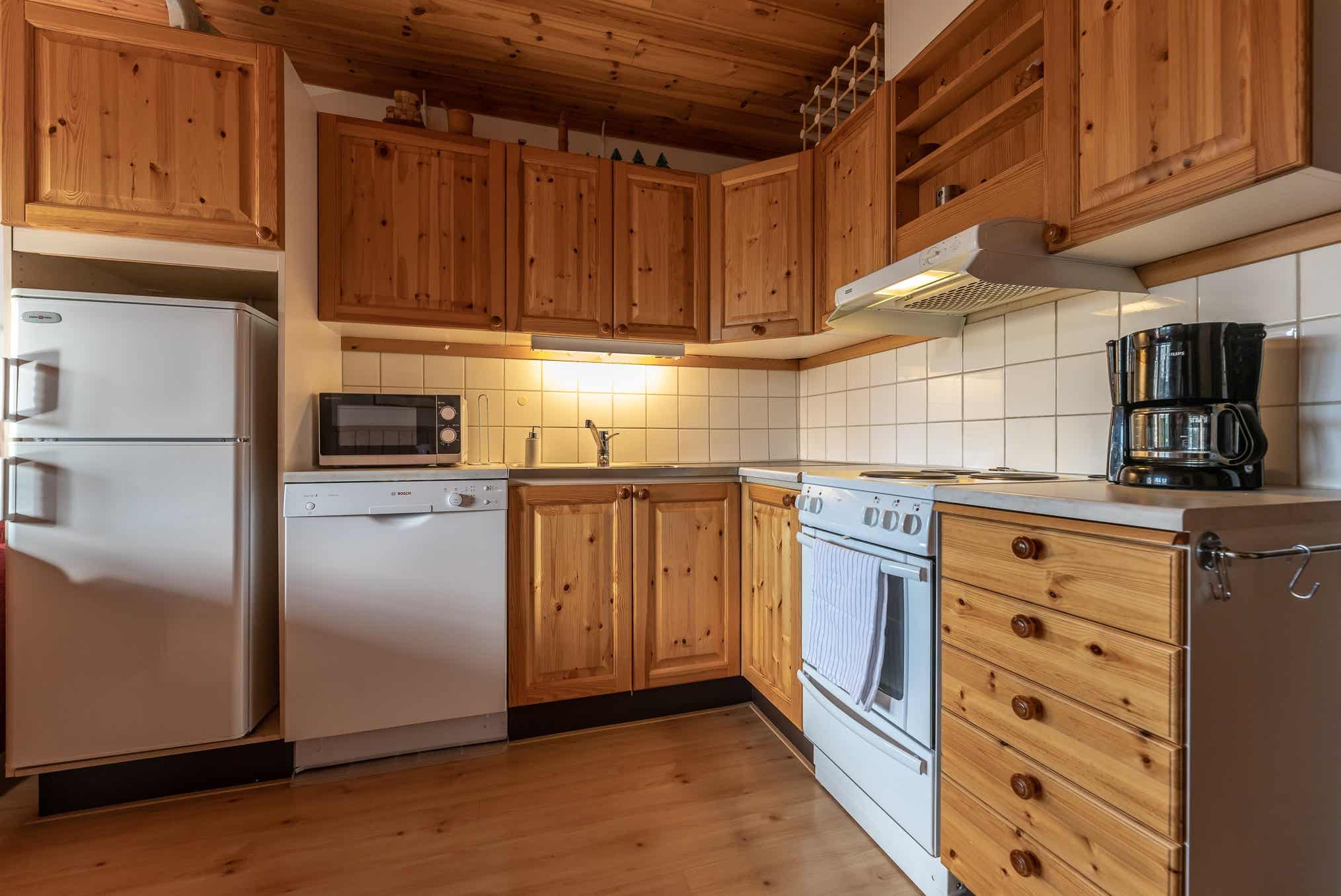 De keuken is voorzien van fornuis met 3 kookplaten en oven, koelkast, vriezer, vaatwasser, magnetron.