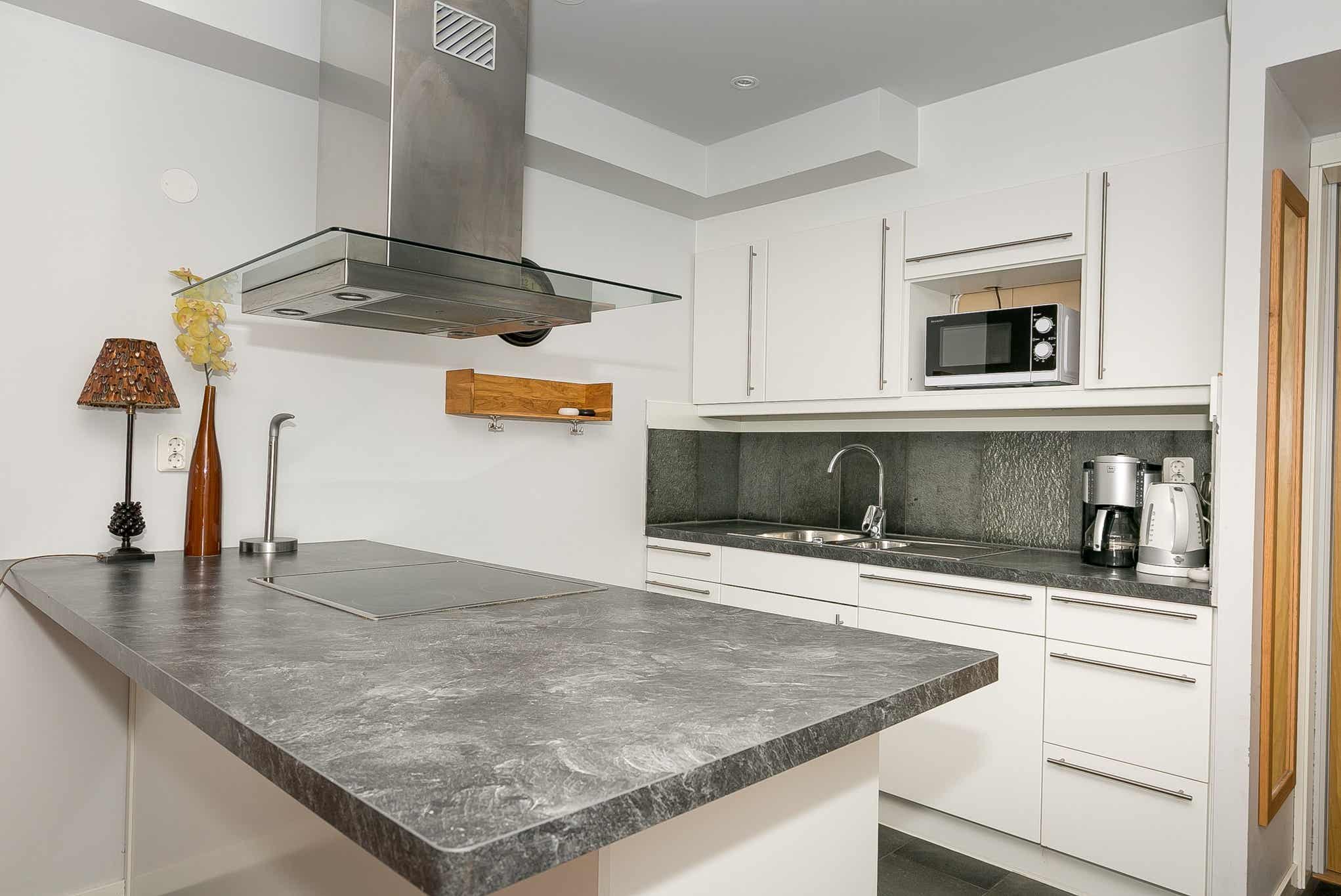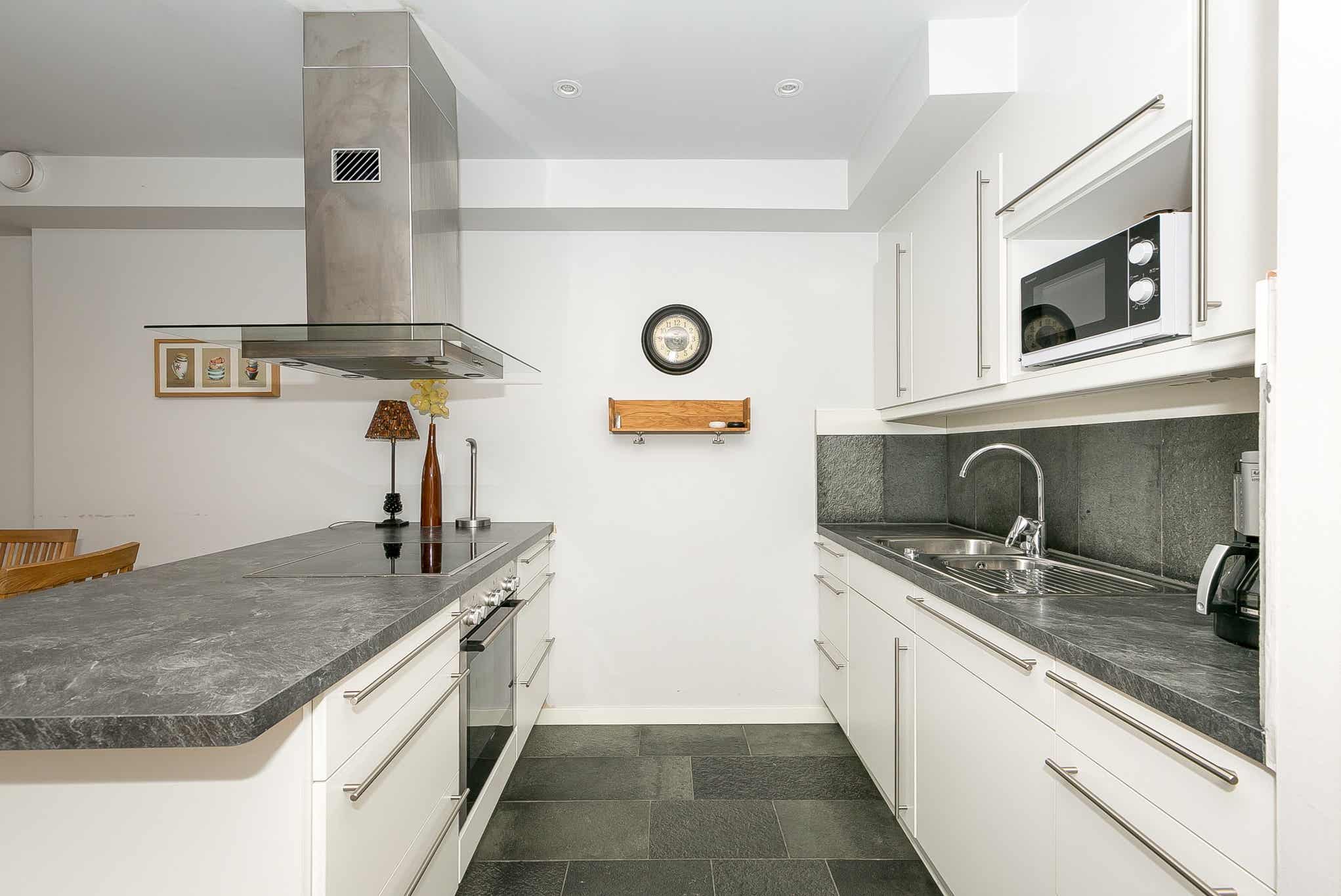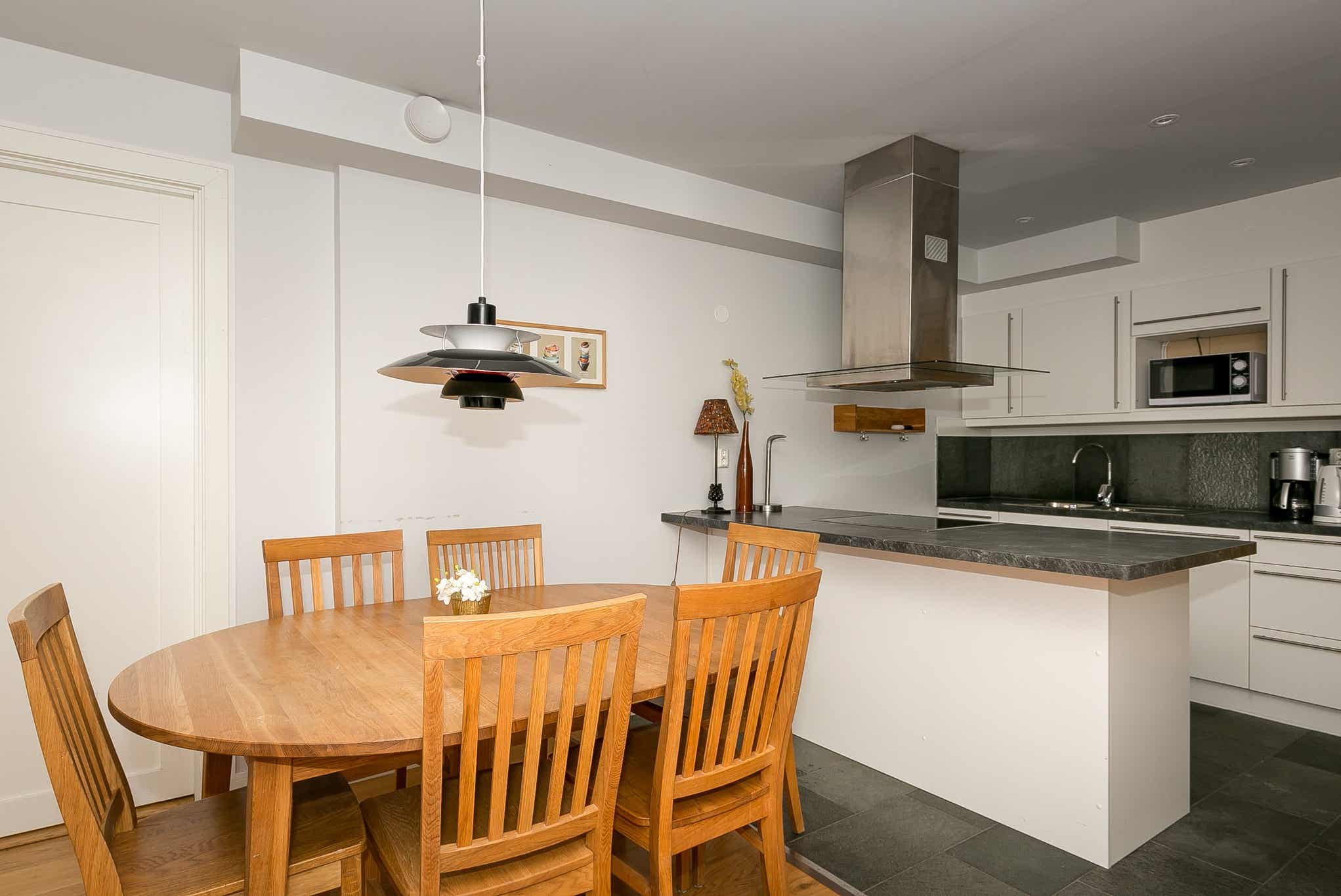 Keuken bevat fornuis met oven, koelkast en vriezer, vaatwasser, magnetron.