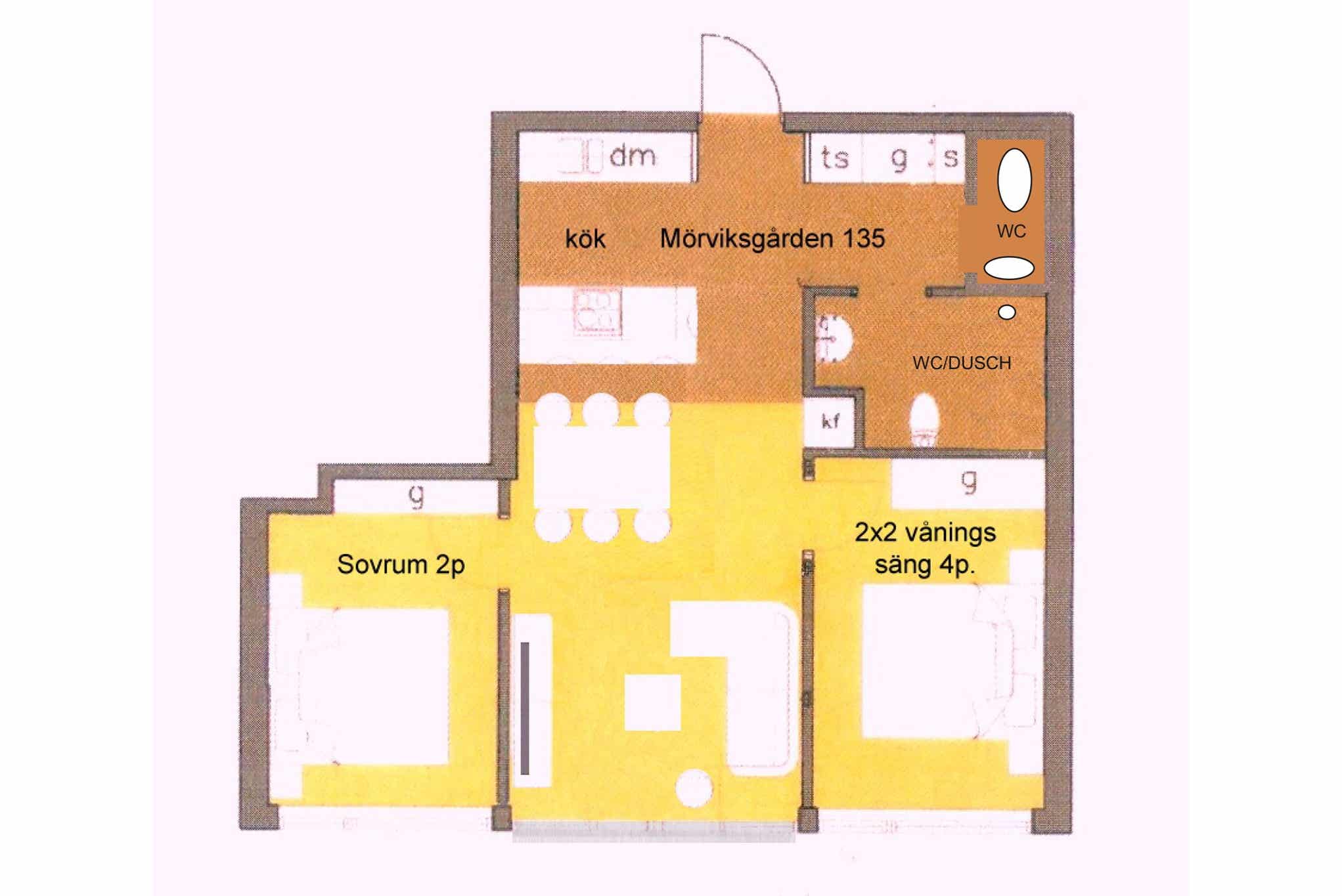 Mörviksgården ligt in Åre By. Appartement op verdieping 1, 6 bedden, 59 m², woonkamer met gecombineerde keuken, 2 slaapkamers, 1 douche, 2 WC.
