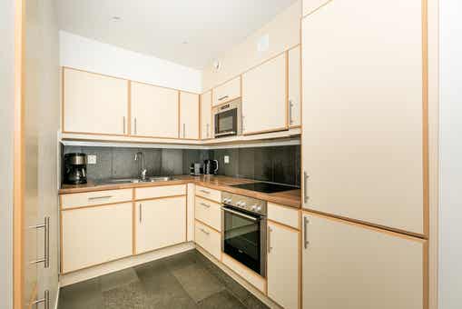 Keuken bevat fornuis met oven, koelkast en vriezer, vaatwasser, magnetron.