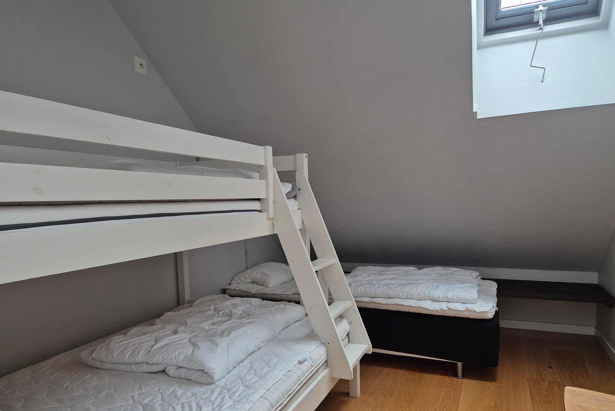 Slaapkamers:Slaapkamer 1 = 1 tweepersoonsbed. Slaapkamer 2 = 1 stapelbed, 1 eenpersoonsbed.