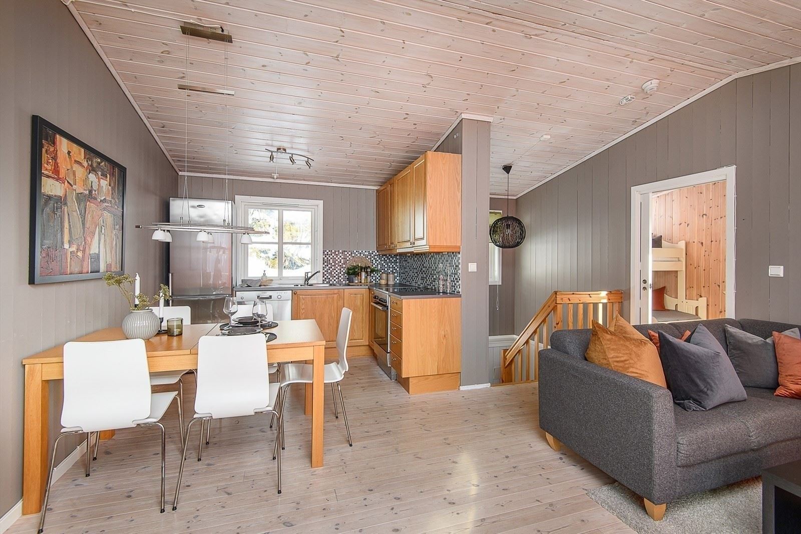 Mosætervegen 111 biedt alles wat u nodig heeft voor een ontspannen verblijf. In de keuken vindt u een gasfornuis, koelkast, vriezer, magnetron, vaatwasser en koffiezetapparaat.