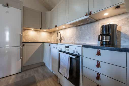 De keuken is voorzien van elektrische kookplaat met oven, koelkast, vriezer, vaatwasser, magnetron.