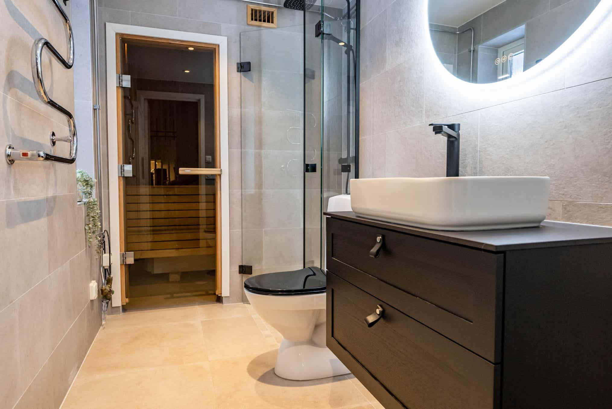 Badkamers:Badkamer 1: met douche/WC/sauna.
