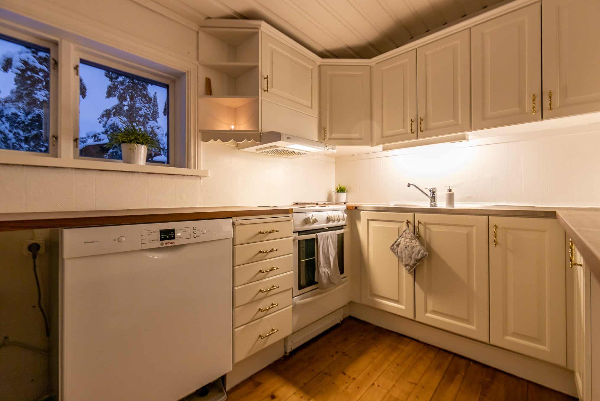De keuken is voorzien van fornuis met oven, koelkast, vriezer, vaatwasser, magnetron.