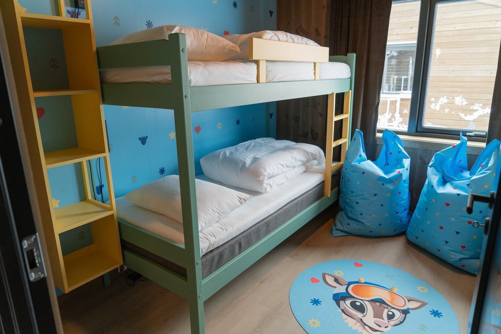 Dit is een van de eigen appartementen van onze mascotte Nore Rein. Het bevat coole nore rendiereffecten zoals illustraties in de slaapkamer, sacco -tassen, kussens en nog veel meer. De perfecte keuze voor het gezin dat gaat skiën.