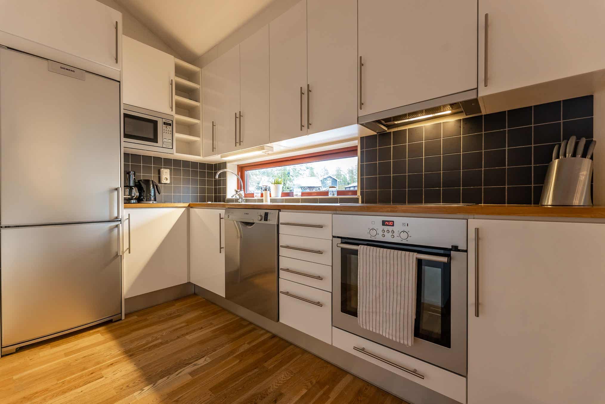 De keuken is voorzien van fornuis met oven, koelkast, vriezer, vaatwasser, magnetron.