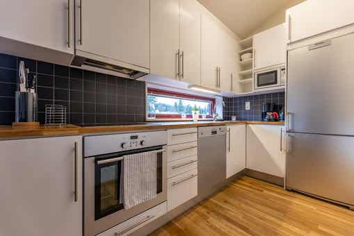 De keuken is voorzien van een elektrische kookplaat met oven, koelkast, vriezer, vaatwasser, magnetron.