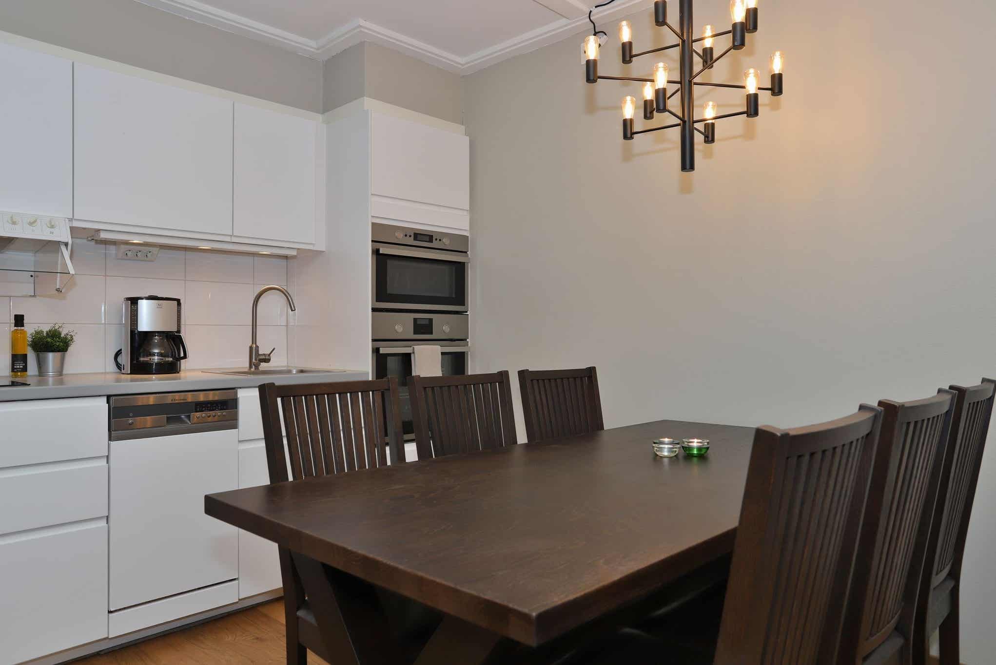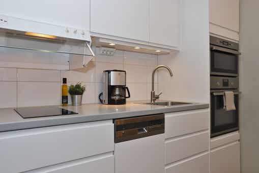 Keuken bevat fornuis met oven, koelkast, vriezer, vaatwasser, magnetron.