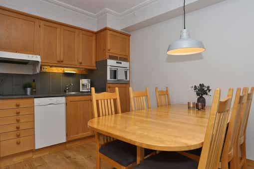 Keuken bevat fornuis met combimagnetron/oven, koelkast met vriesvak, vaatwasser.