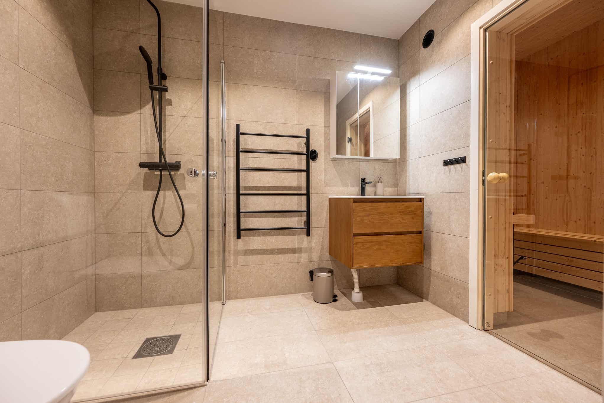 Badkamers:Badkamer 1: met douche/WC/sauna. Badkamer 2: met douche/WC.