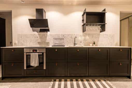 De keuken is voorzien van elektrische kookplaat met oven, koelkast, vriezer, vaatwasser, magnetron.
