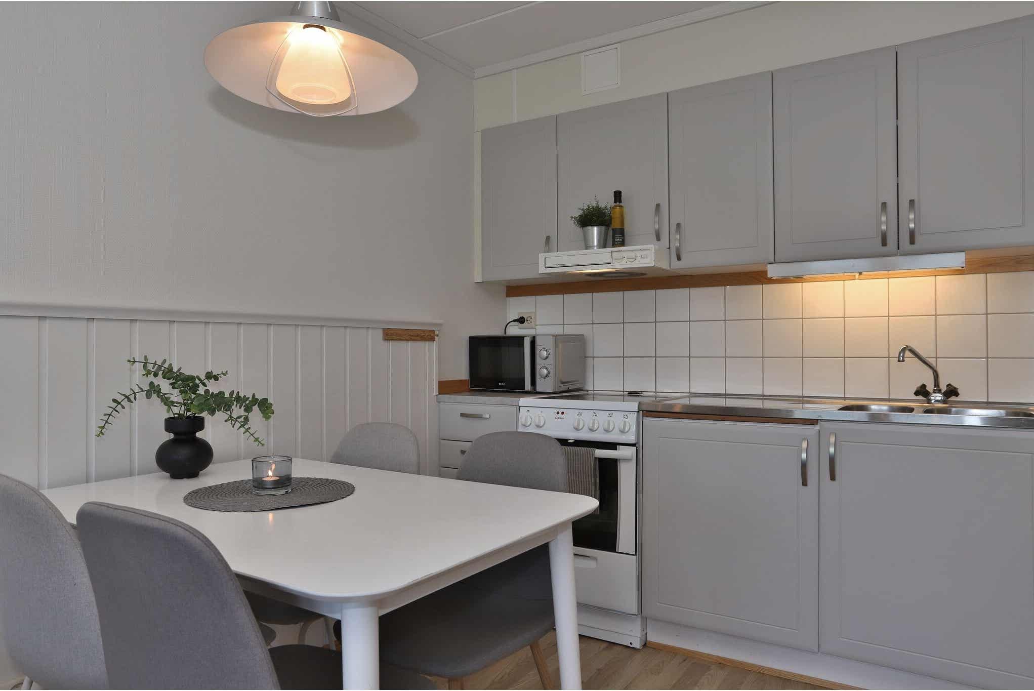 Keuken bevat koelkast met vriesvak, gasfornuis met oven, magnetron.