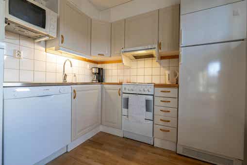 De keuken is voorzien van fornuis met oven, koelkast, vriezer, vaatwasser, magnetron.