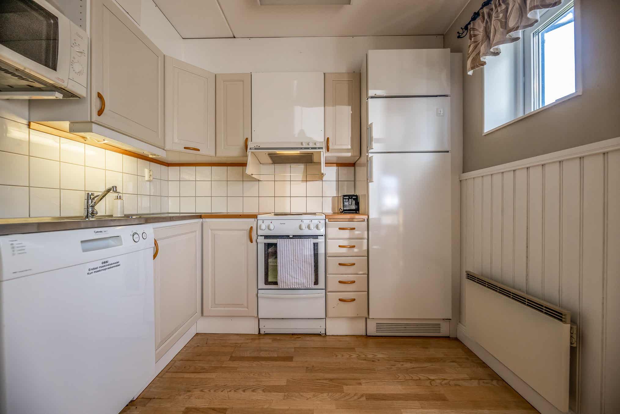 De keuken is voorzien van fornuis met oven, koelkast, vriezer, vaatwasser, magnetron.