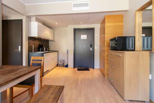 De unit heeft een klein fornuis, koelkast, vaatwasser en magnetron.